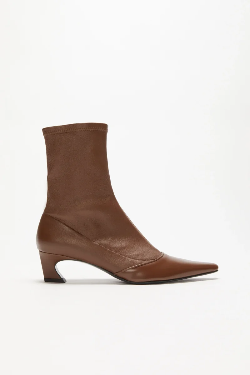 Ankle boots are crafted from leather with a semi-matt and a tonal glossy pointed-toe construction. Detailed with an Acne Studios logo. Complete with a zipper with a curved square heel.