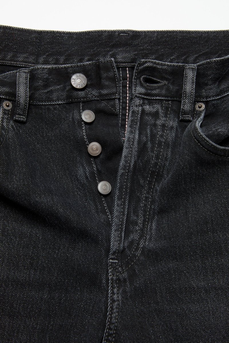 2021 jeans are cut to a loose fit with mid-waist, wide leg and long length. Made from rigid denim in deep black overdye with a washed finish.