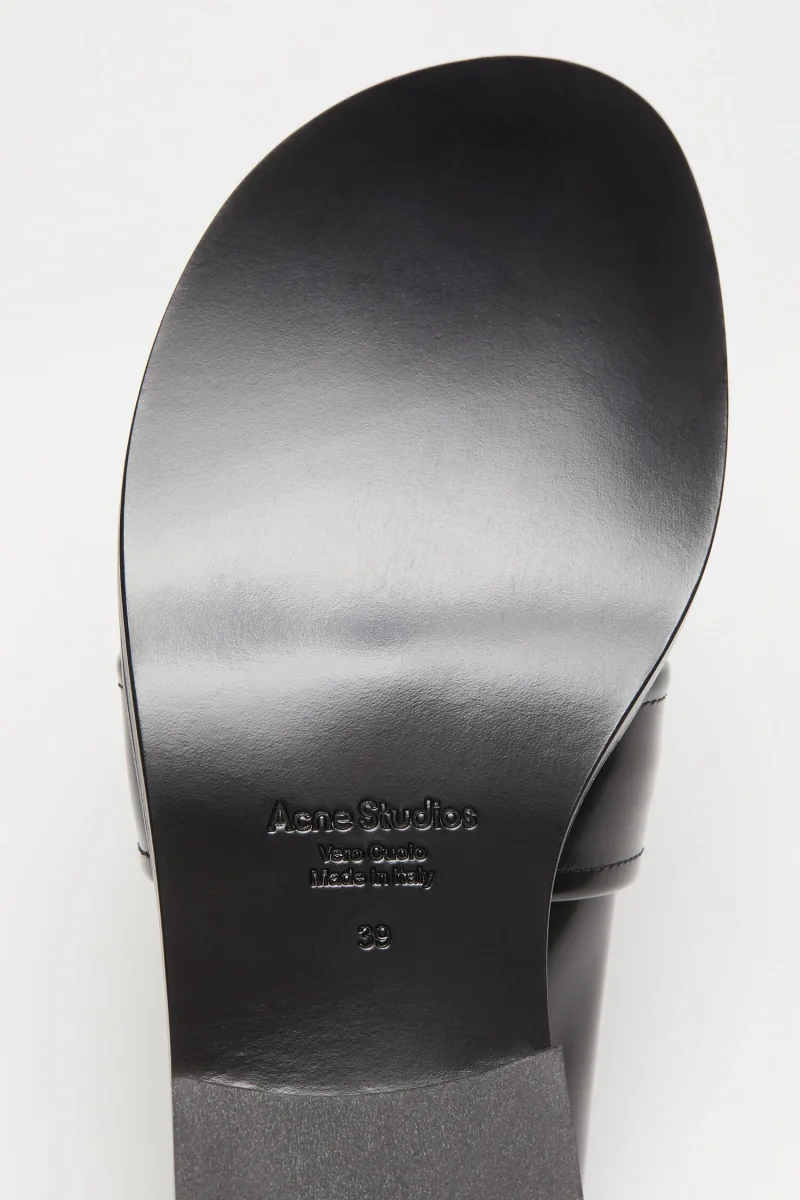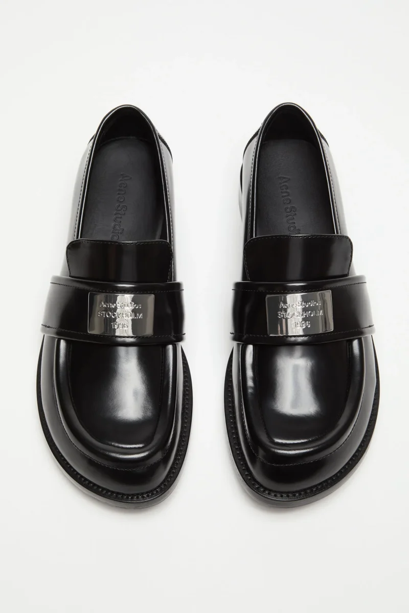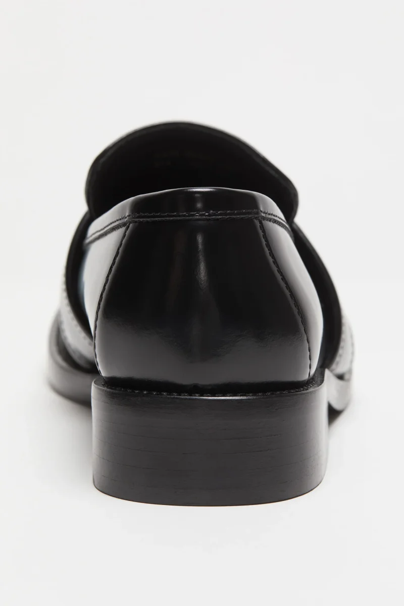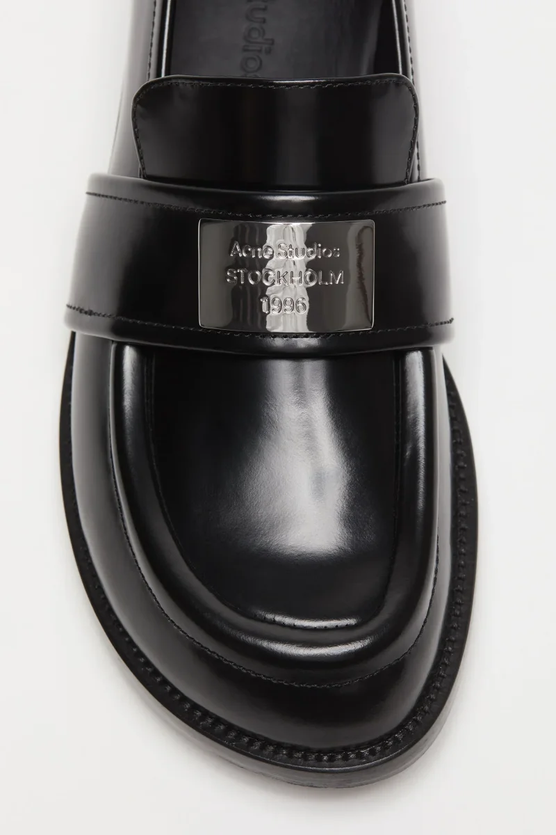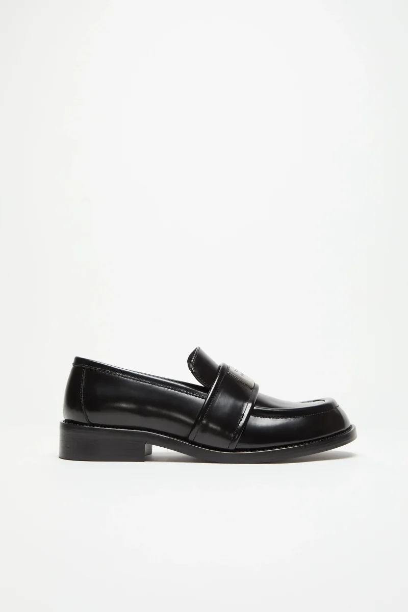 Loafers reimagined in leather, adorned with a logo silver-toned plaque at the front. Complete with a curved toe and short heel.