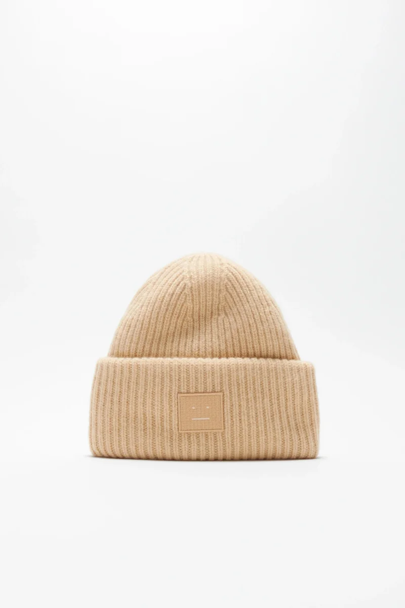 Knit beanie features a large embroidered face logo patch and ribbed detailing, crafted from chunky wool.