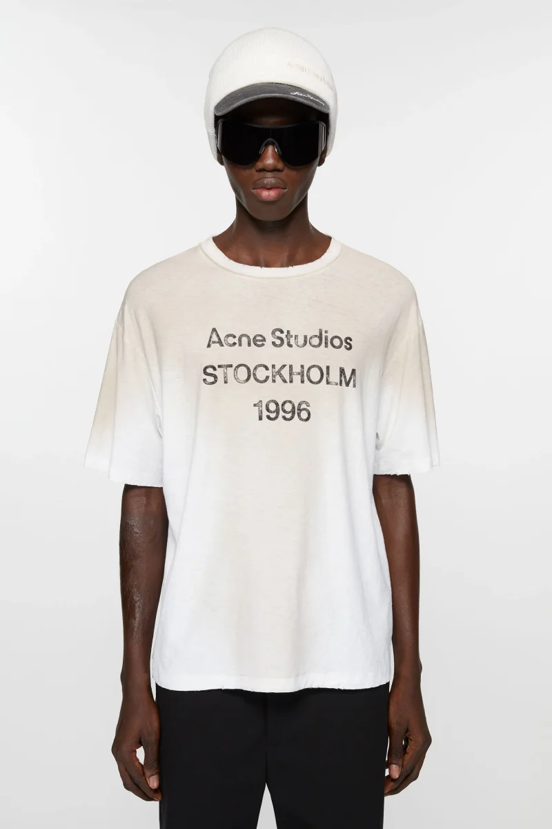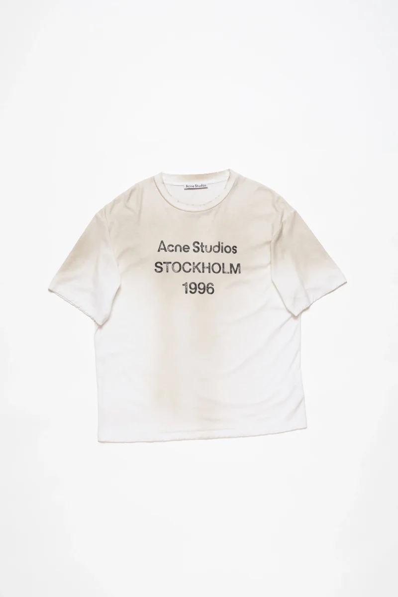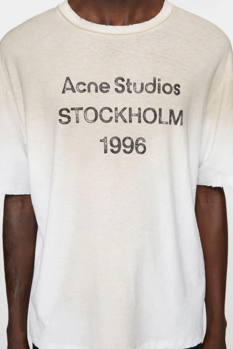 Crew neck t-shirt is cut to a relaxed unisex fit. Detailed with an Acne Studios 1996 stamp logo, distressed neckline, cuffs and bottom hem. Crafted from cotton with a sprayed vintage finish.