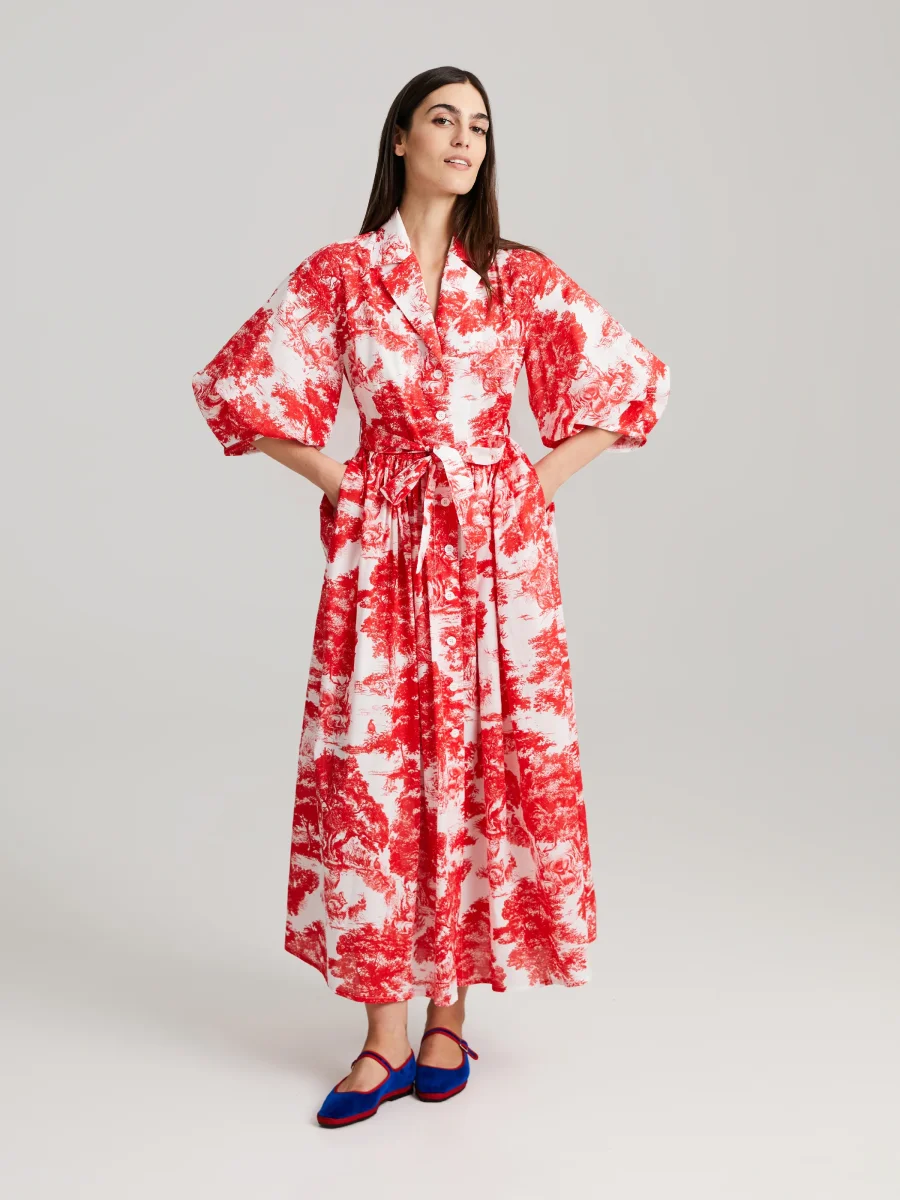Vadlång skjortklänning i Toile de Jouy-tryck. Äkta skalknäppning framtill, sidofickor, kragar, 3/4 långa ärmar och matchande avtagbart bälte. Tillverkad av högkvalitativt italienskt bomullstyg.