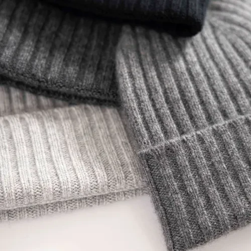 Ribbstickad mössa med uppvik, tillverkad i 100 % kashmir – ett exklusivt naturmaterial känt för sin oöverträffade mjukhet, värme och lätthet. Den klassiska designen med strukturstickning ger ett elegant och avskalat uttryck, samtidigt som kashmirens naturliga egenskaper gör mössan både varm och ventilerande. En lyxig vardagsaccessoar som förenar stilren form med exceptionell komfort – perfekt för dig som söker en mössa i premiumkvalitet med tidlös estetik och mjuk känsla mot huden.