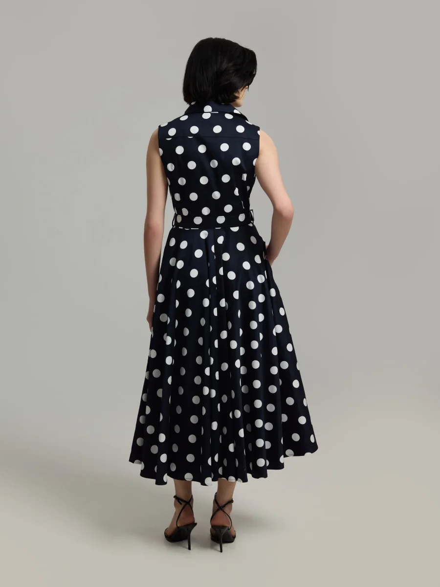 Sleeveless dress with an elegant mid-length silhouette. Dress features a tailored collar, fitted body and full A-line hem. Finished with hidden side pockets and detachable tonal belt. Made of Italian cotton satin.