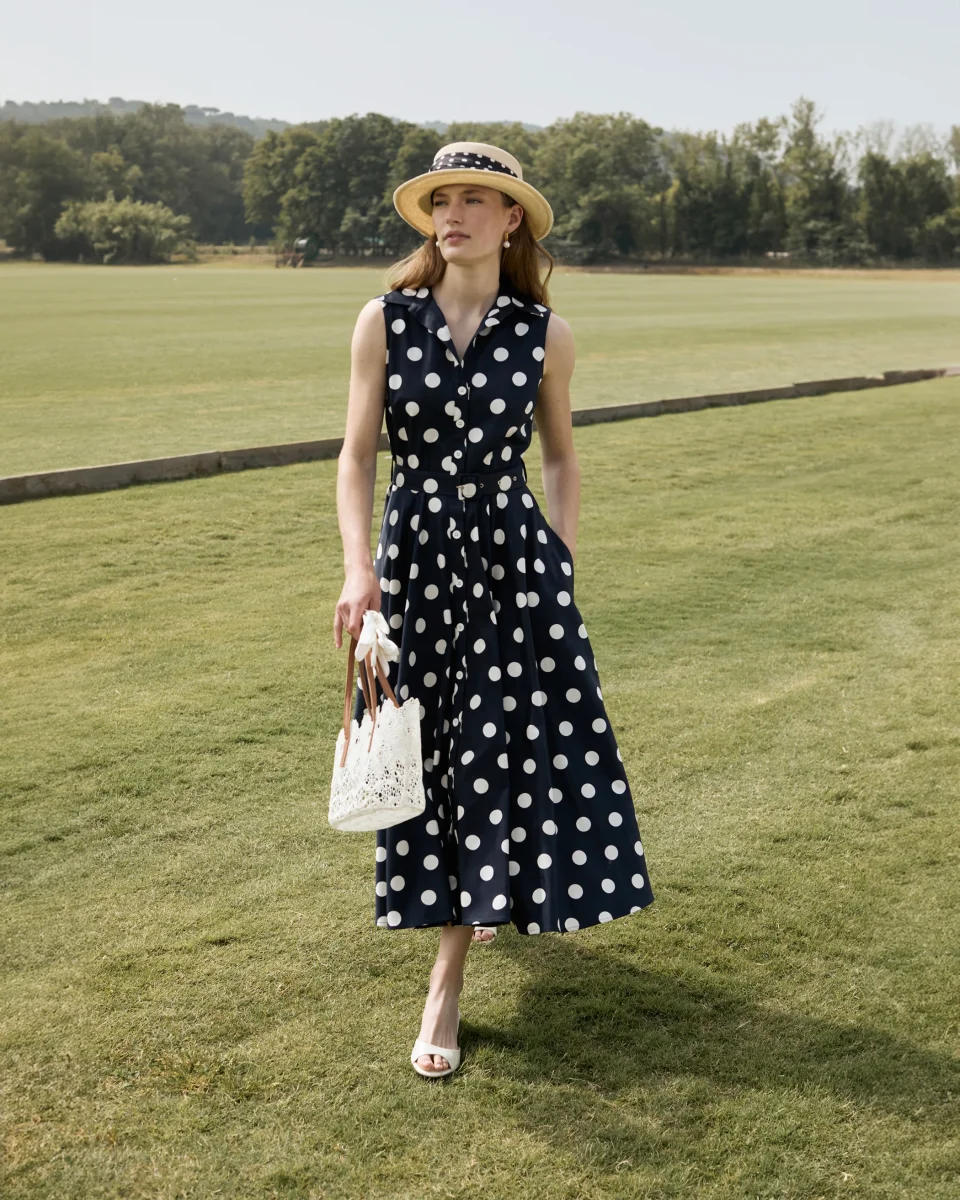 Sleeveless dress with an elegant mid-length silhouette. Dress features a tailored collar, fitted body and full A-line hem. Finished with hidden side pockets and detachable tonal belt. Made of Italian cotton satin. A-line Fitted body Mid-length hem Hidden side pockets Button closure Detachable belt