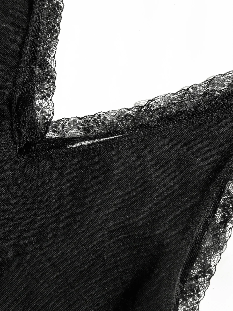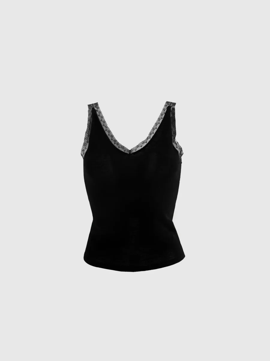 Topp i merinoull med spetsdetaljer och V-halsringning.