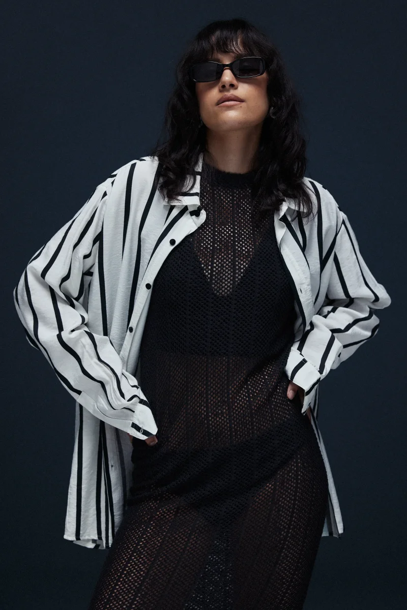 Hooper Viscose Stripe Shirt, a stylish and versatile piece inspired by classic men’s tailoring. This light viscose shirt features elegant black pearl buttons at the front and cuffs. Designed with a Straight bottom and loose fit, it offers a slightly oversized silhouette that flatters both men and women.