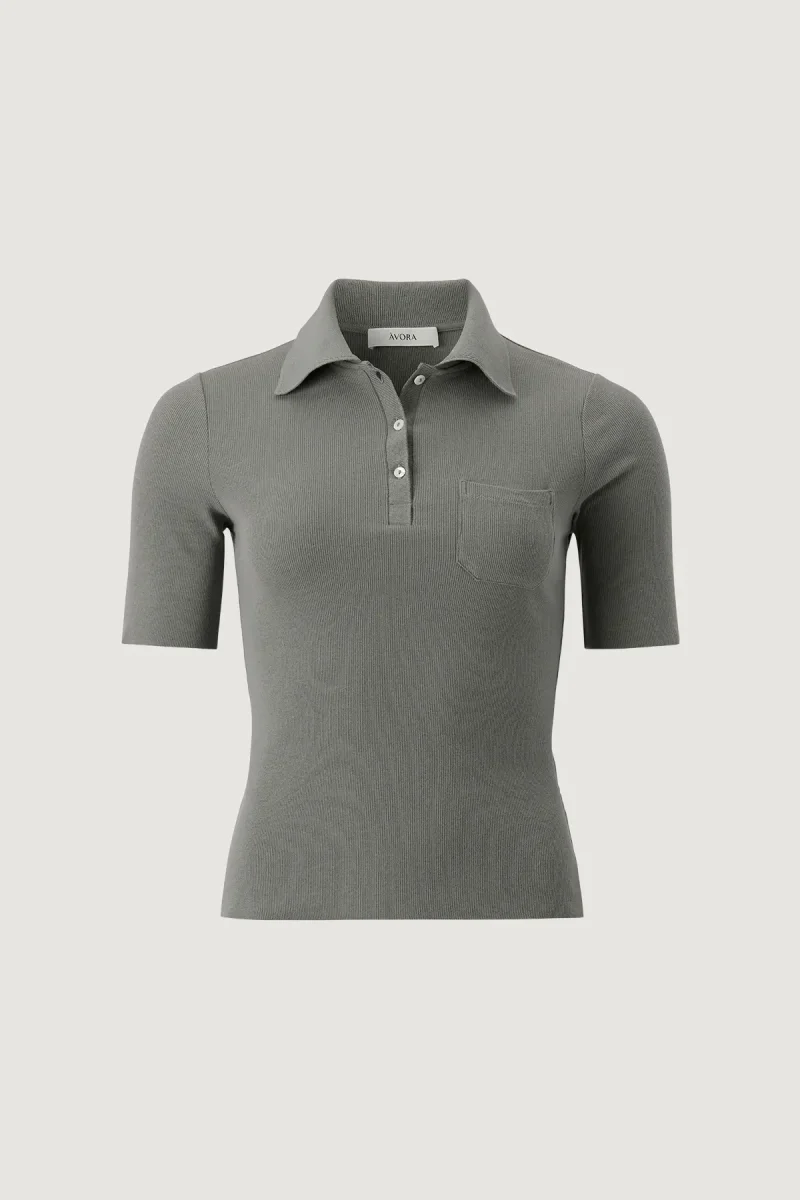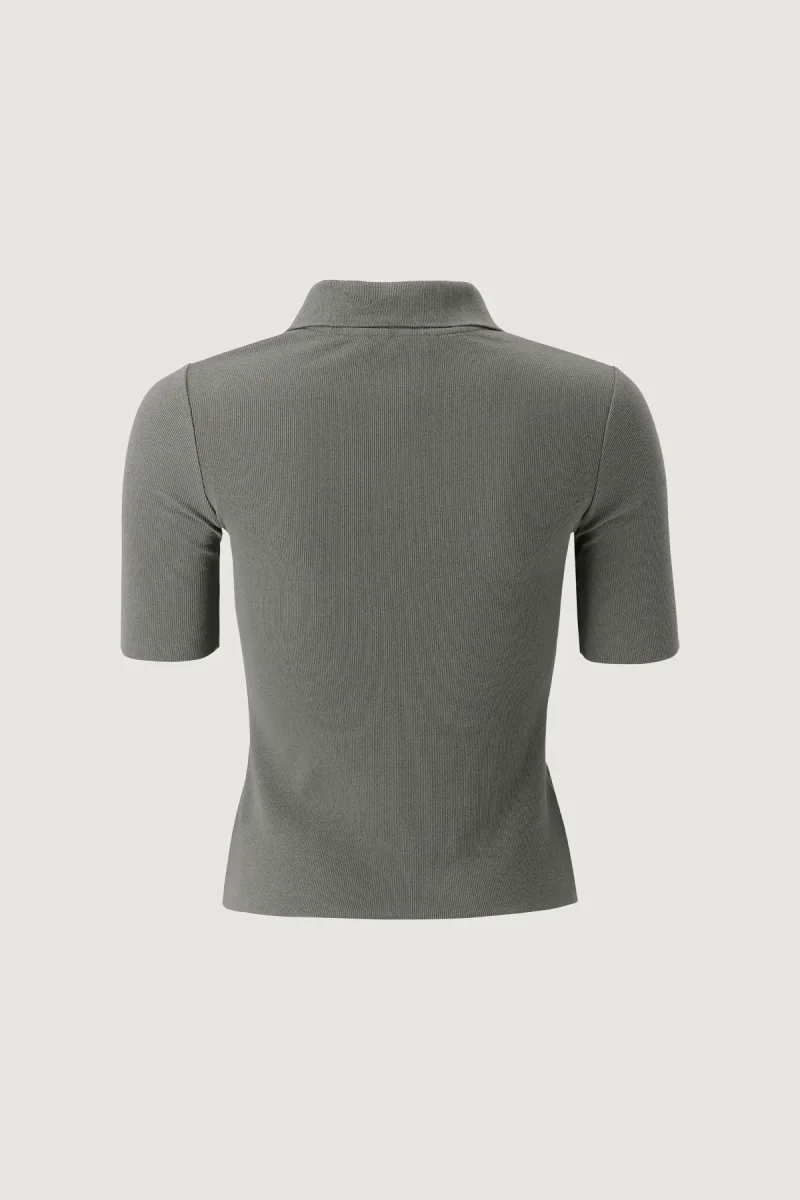 The Polo Tee is crafted from ribbed jersey fabric and has a contrasting collar with a three-button closure. It features slightly longer sleeves and raw edges at the sleeve openings and bottom hem. The product is true to size.
