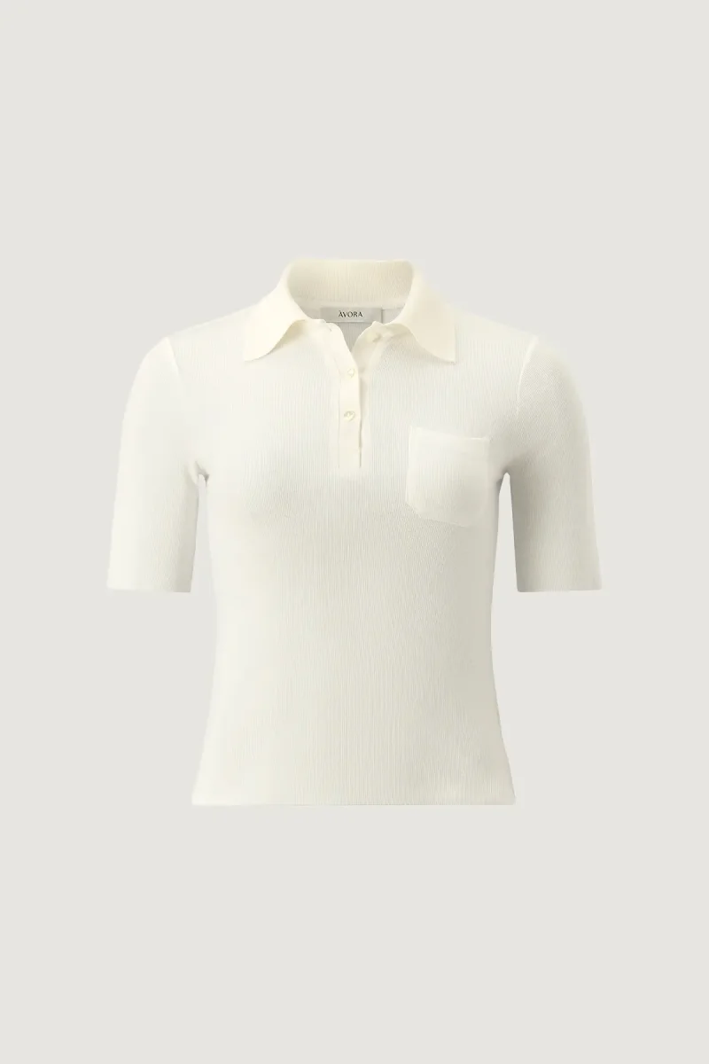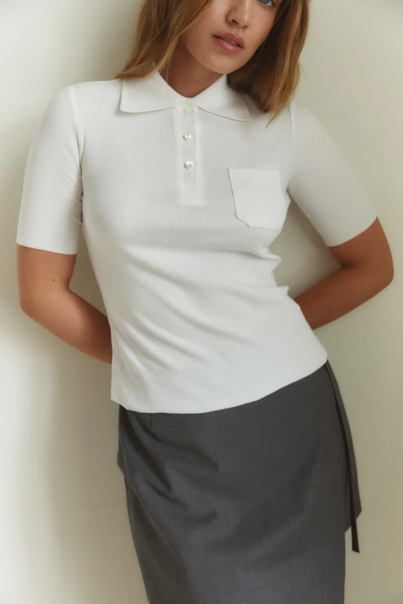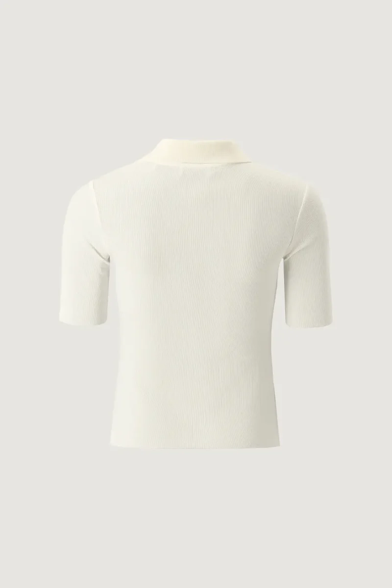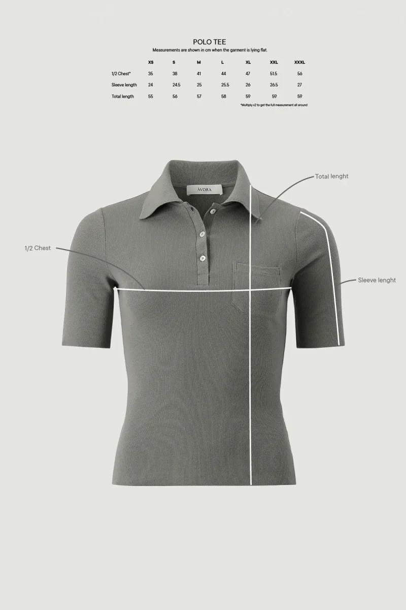 The Polo Tee is crafted from ribbed jersey fabric and has a contrasting collar with a three-button closure. It features slightly longer sleeves and raw edges at the sleeve openings and bottom hem. The product is true to size.