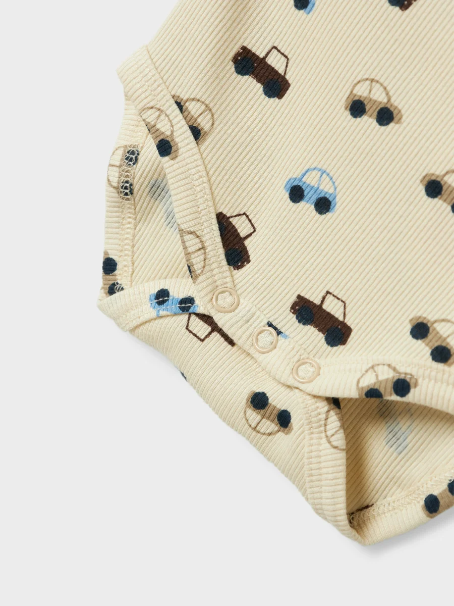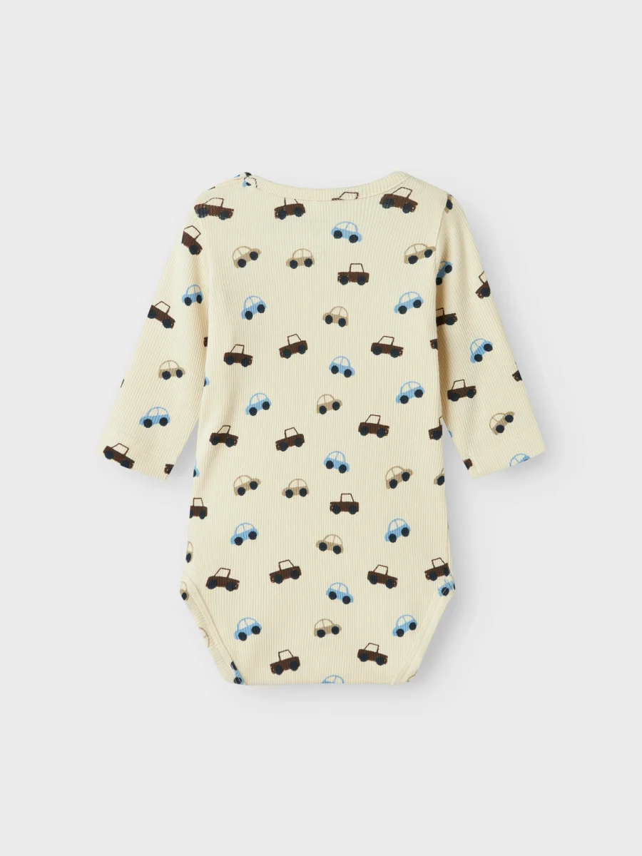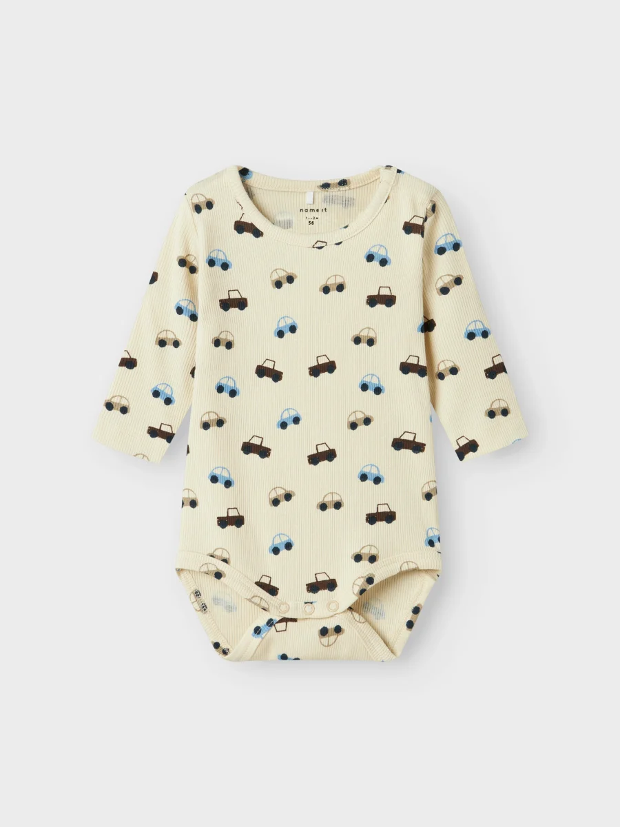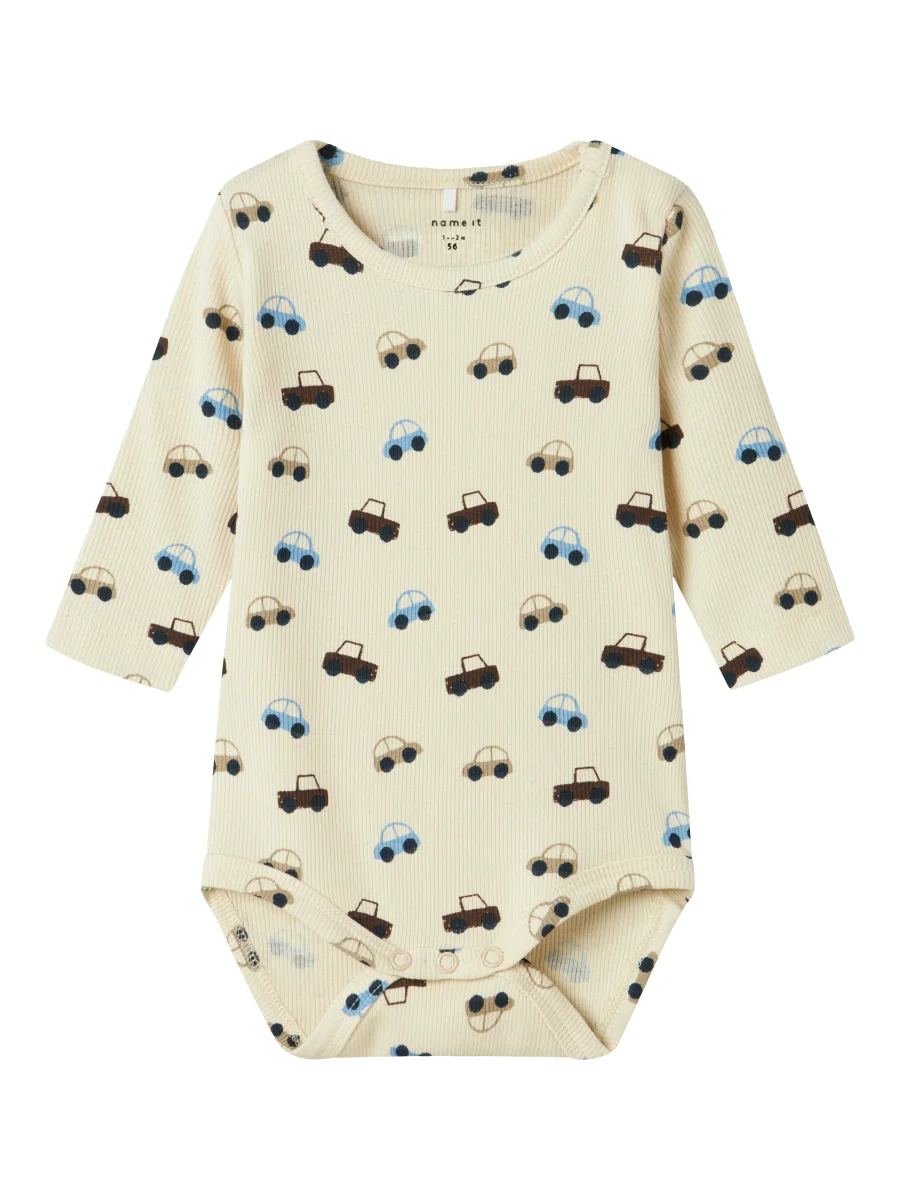 Söt naturvit ekologisk baby body med bilar. Ribbstickad tröja har ett vertikalt, randigt mönster och bra elasticitet för en skön känsla och en tidlös look.