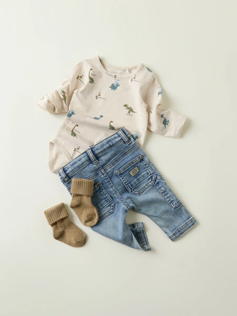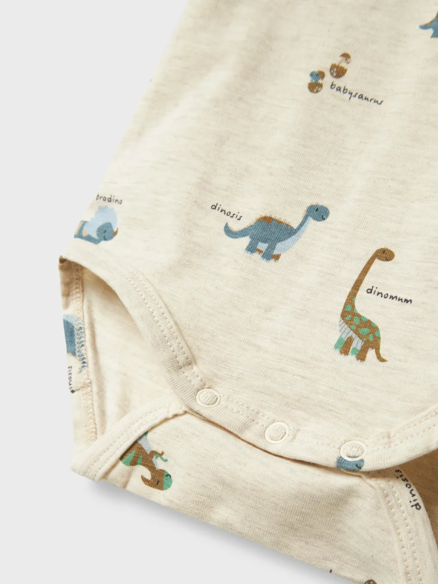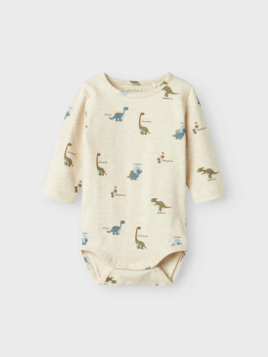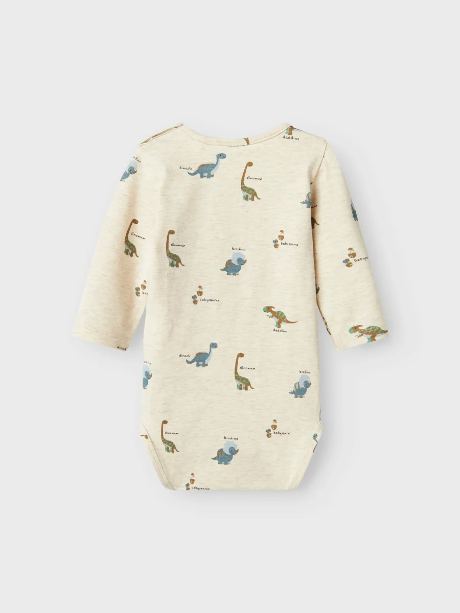 Långärmad BabyBody med små söta dino på. Skön ekologisk bomull på gulligt printad bodysuit.