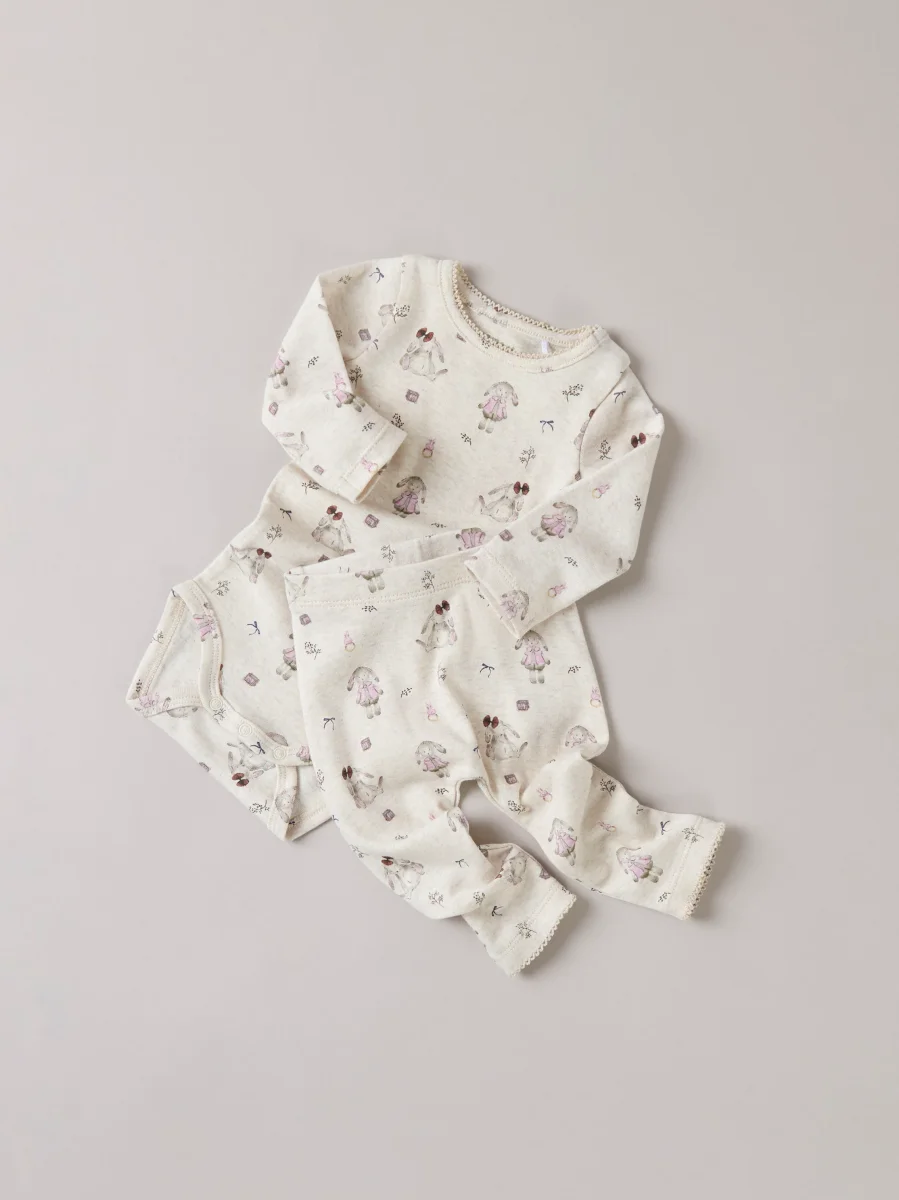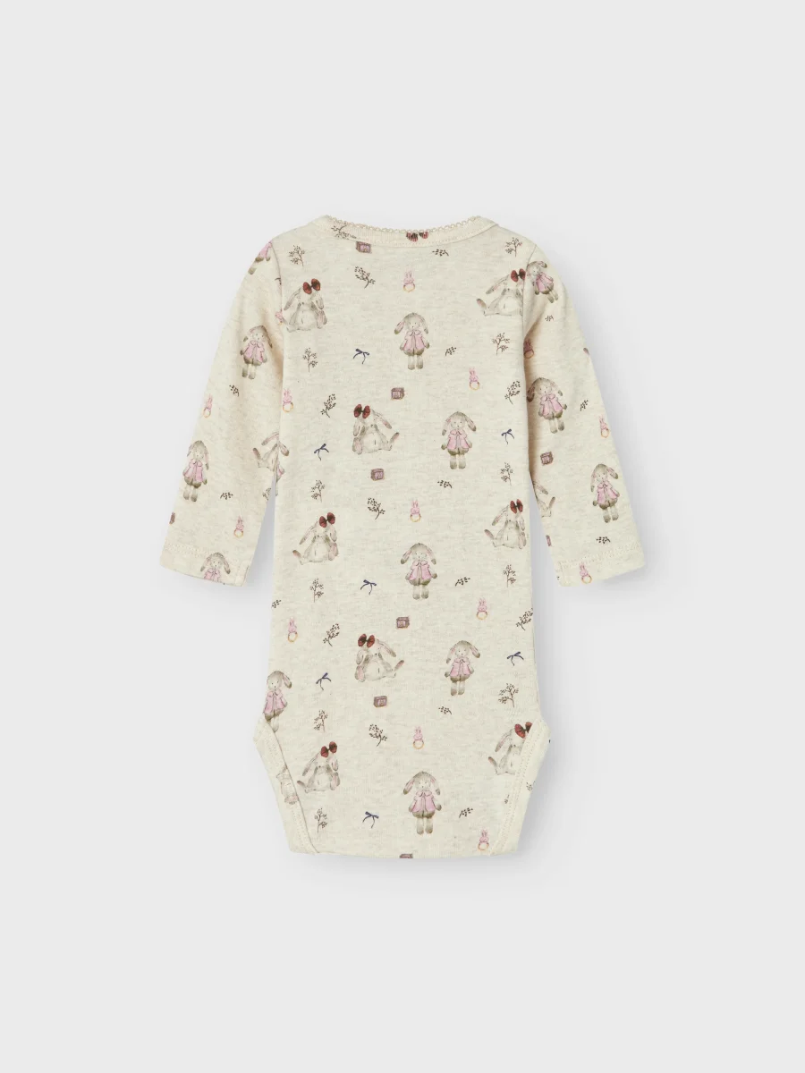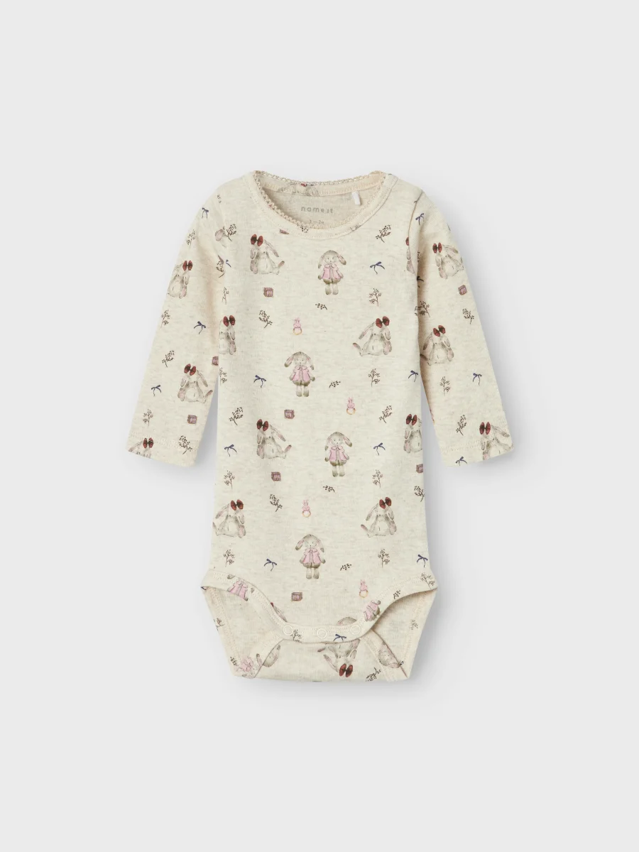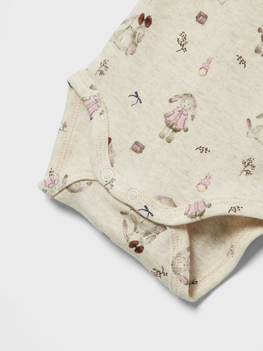 Söt bebis body med beige botten och söta små kaniner överallt. Ekologisk baby body till den som vill ha något riktigt mjukt och gulligt. Jersey är ett lätt och stretchigt tyg med en mjuk yta och insida för en bekväm känsla och rörelsefrihet.