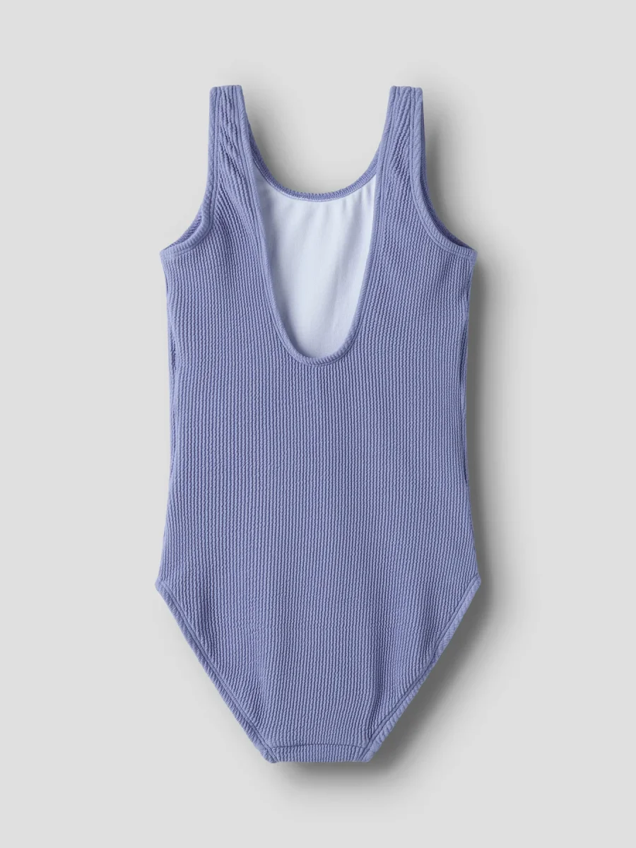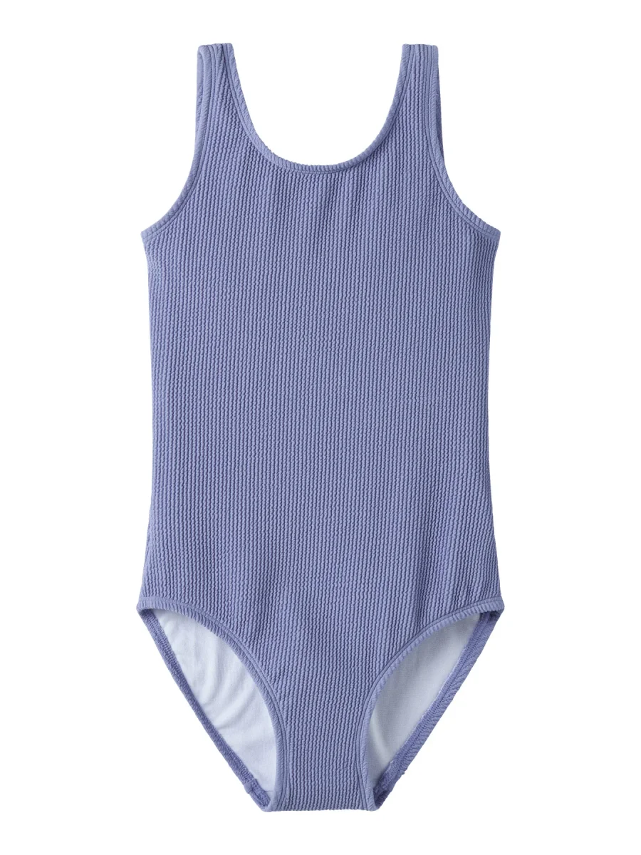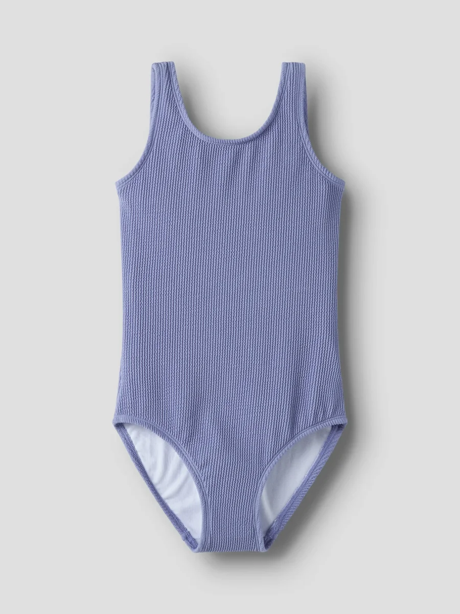 En superfin enfärgad baddräkt i härlig gul nyans från Name It. Den trendiga krusiga strukturen i tyget (crinkle/seersucker) ger baddräkten en extra snygg look och gör den både modern och unik.