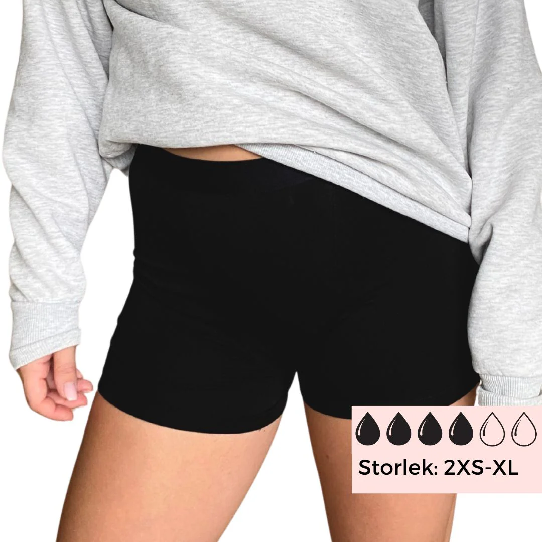 Menstrosa i boxermodell med korta ben, låg midja och bekväm resår som passar många kroppar och tillfällen. En trygg trosa för aktiva dagar och läckagefria nätter. Den används ofta med rikligt flöde i upp till 6 timmar och med måttligt flöde upp till 12 timmar.