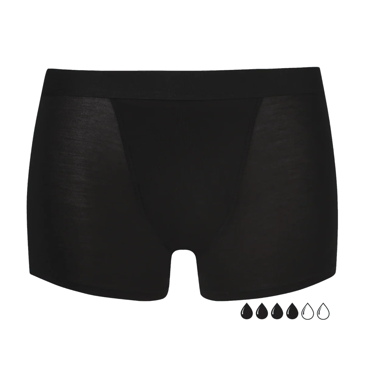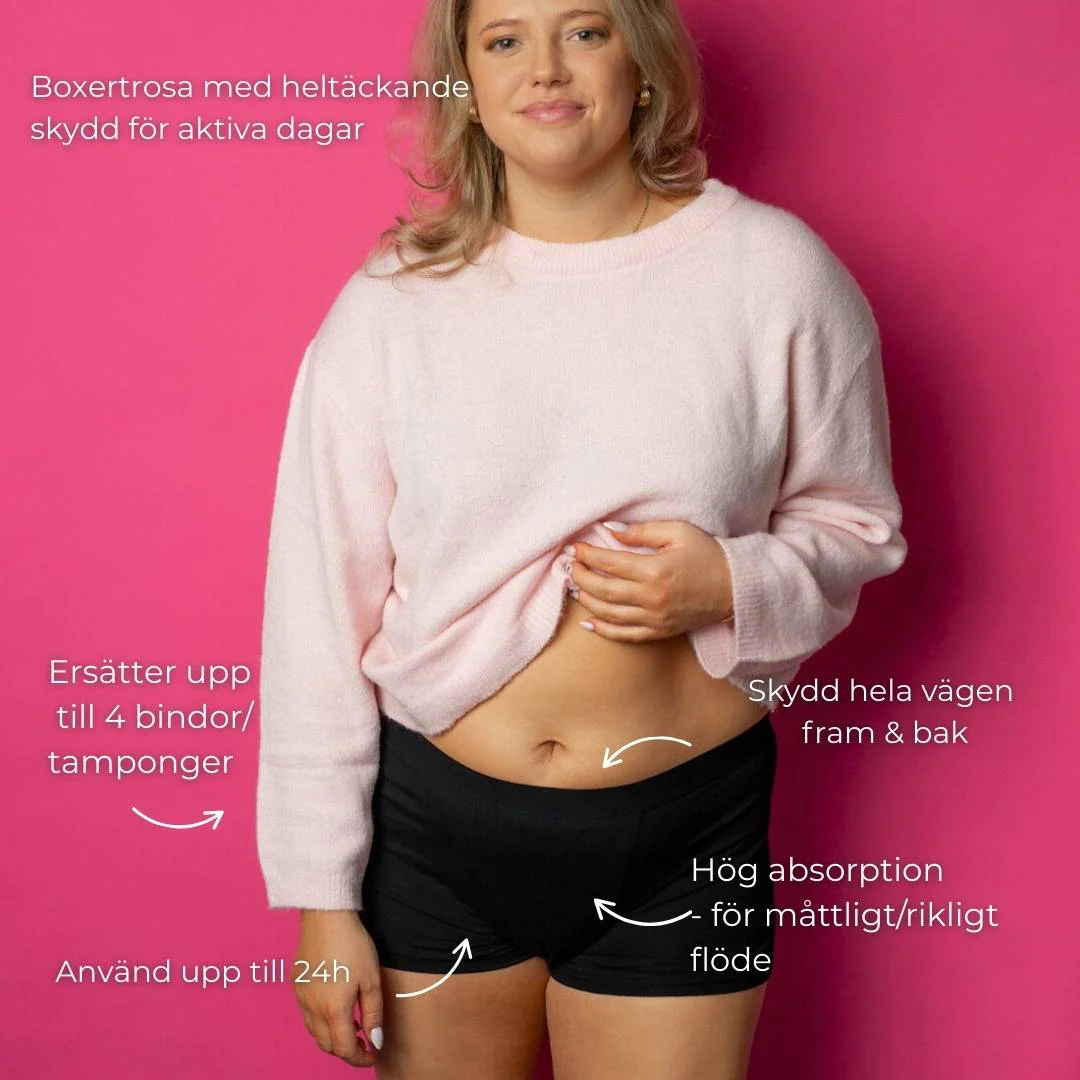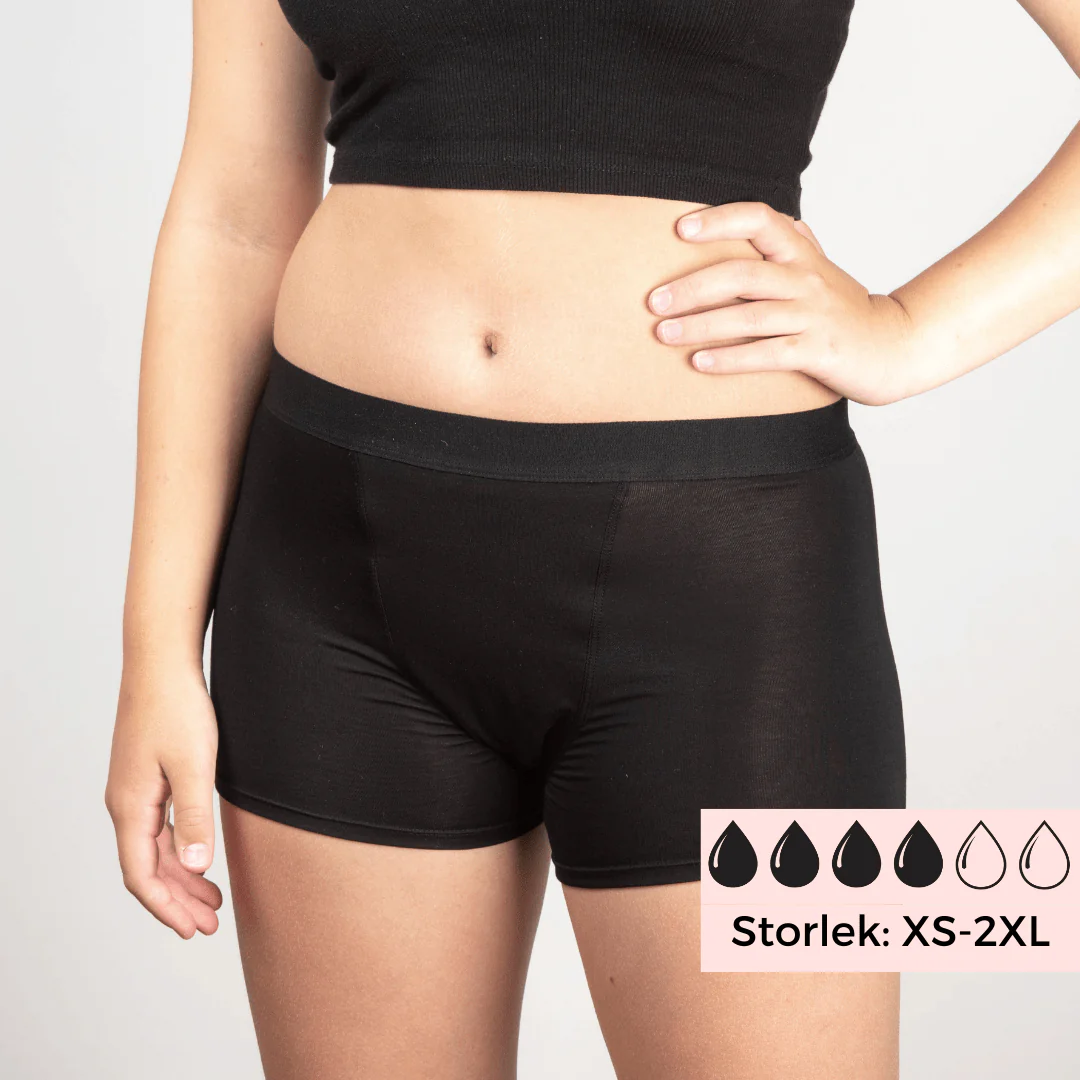 Menstrosa i boxermodell med korta ben, låg midja och bred resår som passar många kroppar och tillfällen. En trygg trosa för aktiva dagar och läckagefria nätter. Den används ofta med rikligt flöde i upp till 6 timmar och med måttligt flöde upp till 12 timmar.