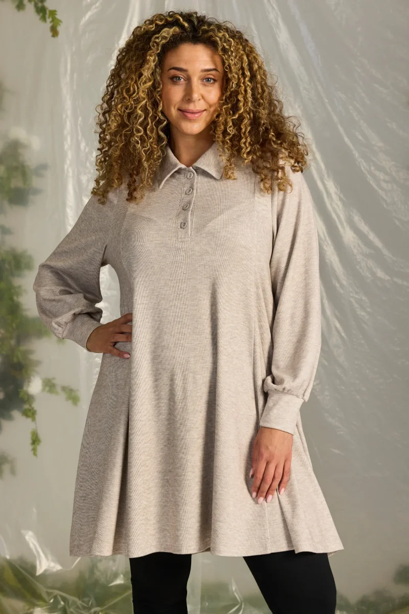 Mysig A-formad tunika med en klassisk skjortkrage och långa ärmar, denna kan du både bära till leggings eller matcha med byxorna i samma färg.