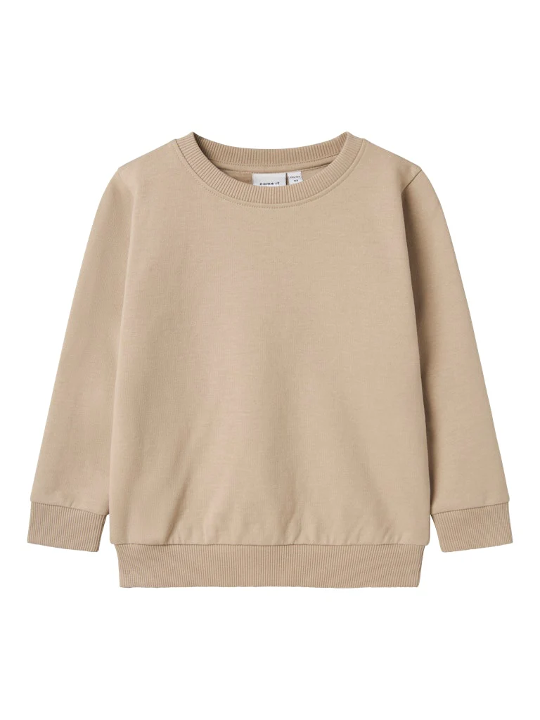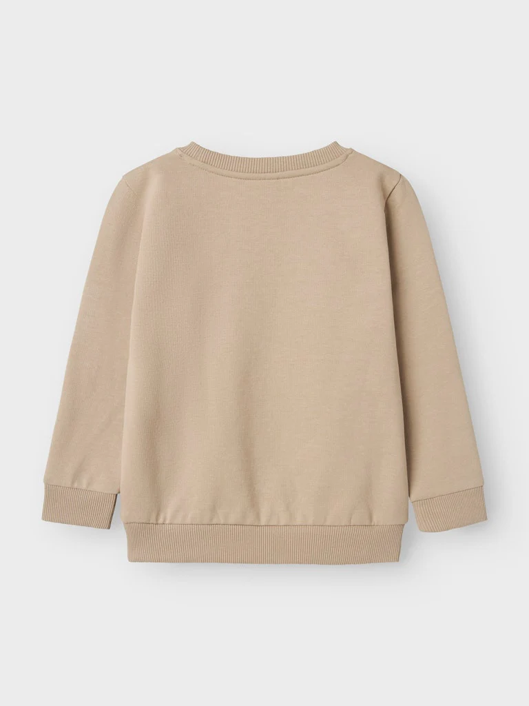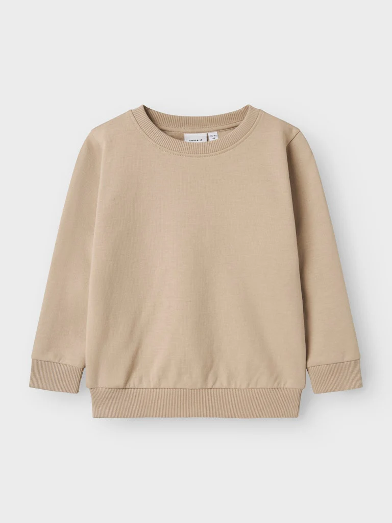 Den här beige sweatshirten är tillverkad i borstad sweatshirtkvalitet med mjuk insida som känns skön mot huden hela dagen. Den neutrala färgen gör den lätt att matcha med allt från leggings till jeans, och den klassiska passformen med ribbade muddar ger både stil och rörelsefrihet. En mångsidig favorit för både förskola och familjeutflykter.
