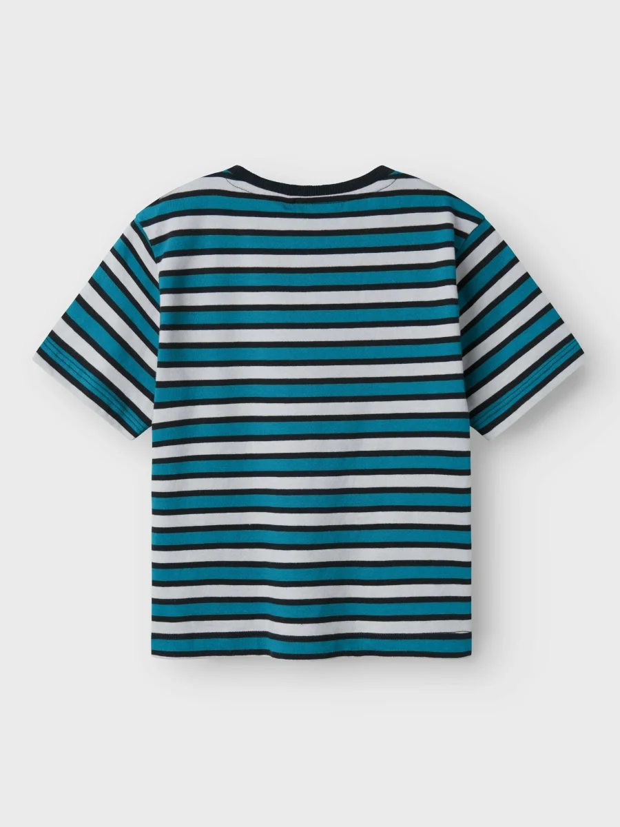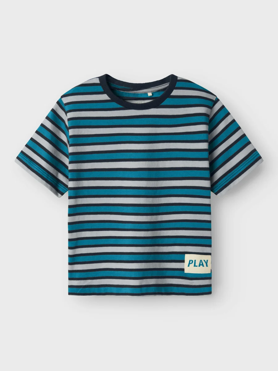 Blå och vit randig kortärmad t-shirt med rund hals.