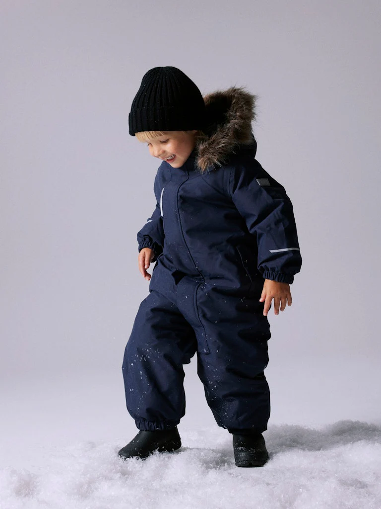 Overallen har en mysig, avtagbar fuskpälskrage på luvan och är designad i en klassisk blå ton som gör den både praktisk och fin.