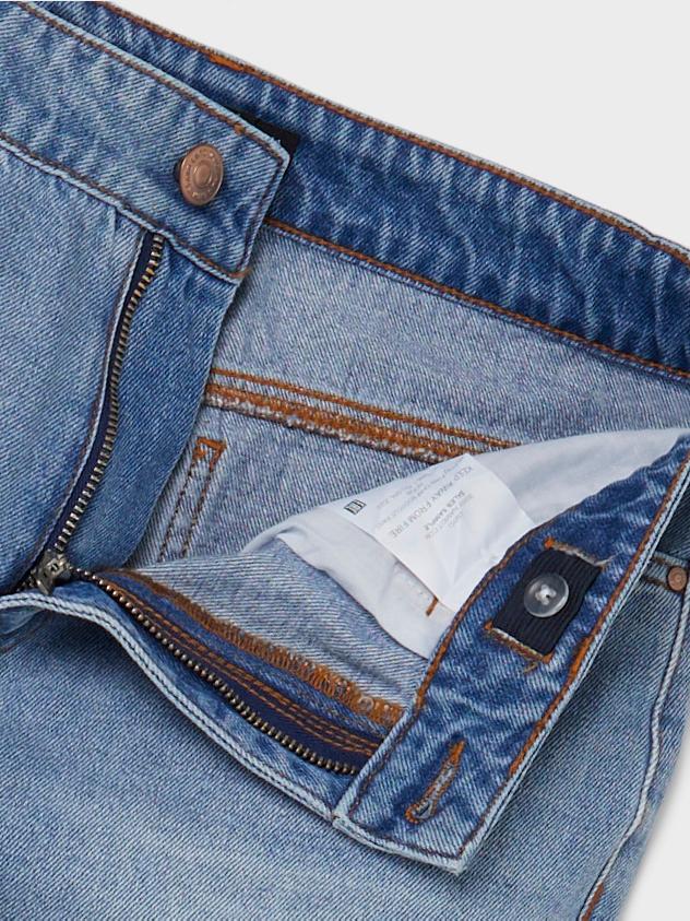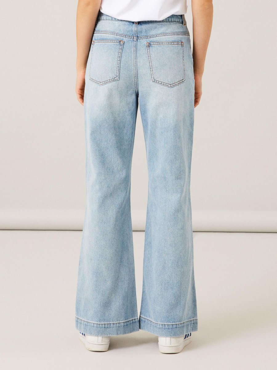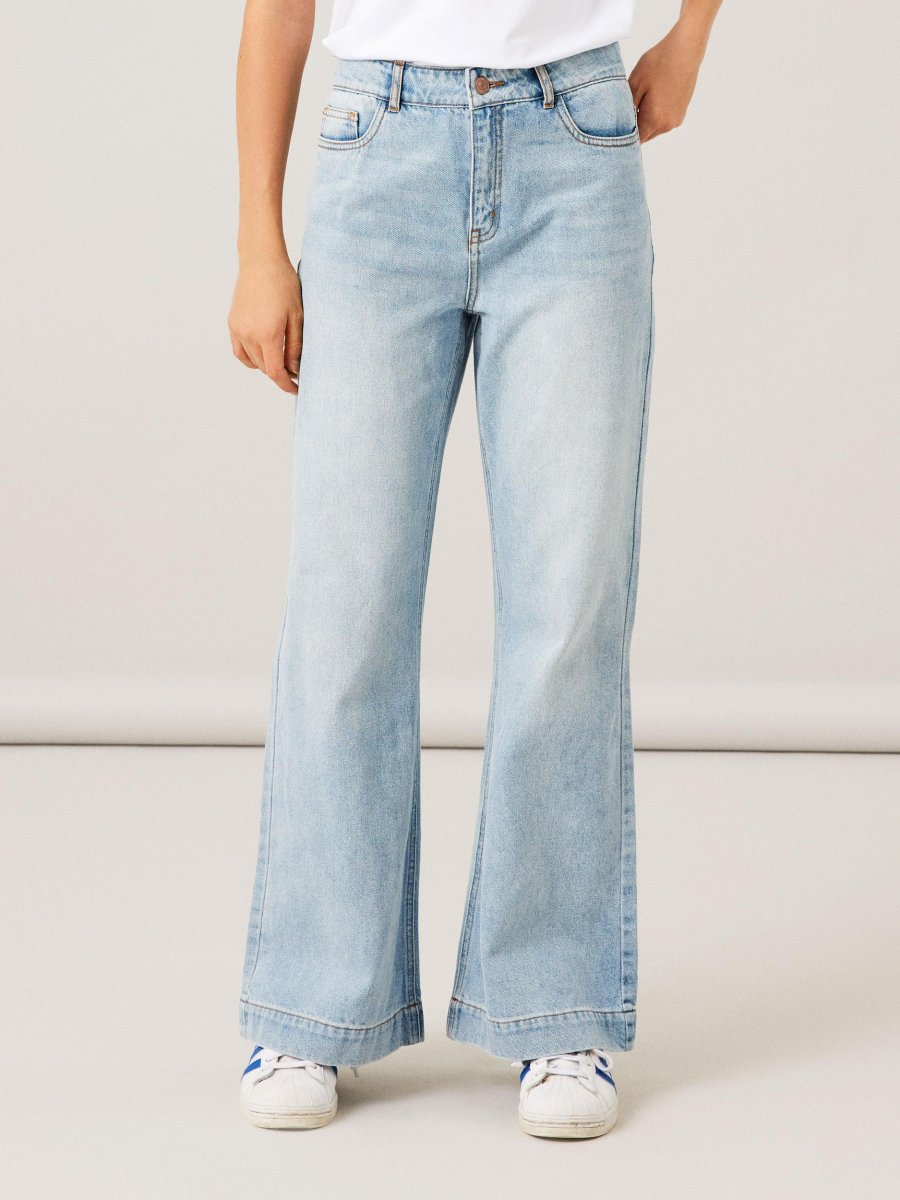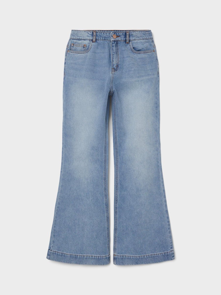 Ljus denim i mjuk stretch med utsvängda ben nertill, så kallade bootcut.