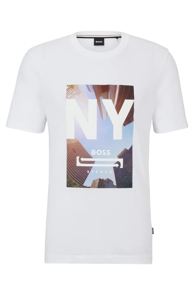 A new-season T-shirt by BOSS Menswear, cut to a straight fit in cotton jersey with printed artwork in mixed media at the chest. Regular fitShort sleevesStandard length 100% cotton