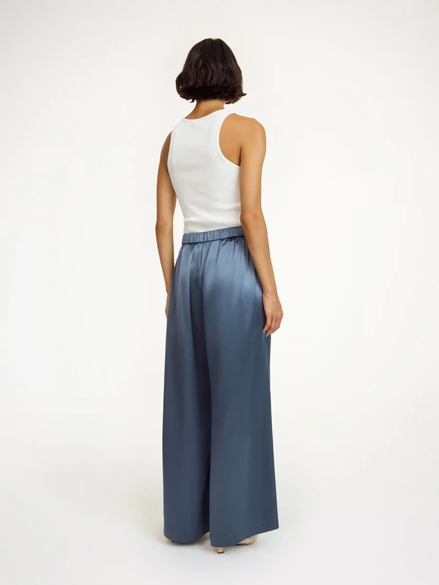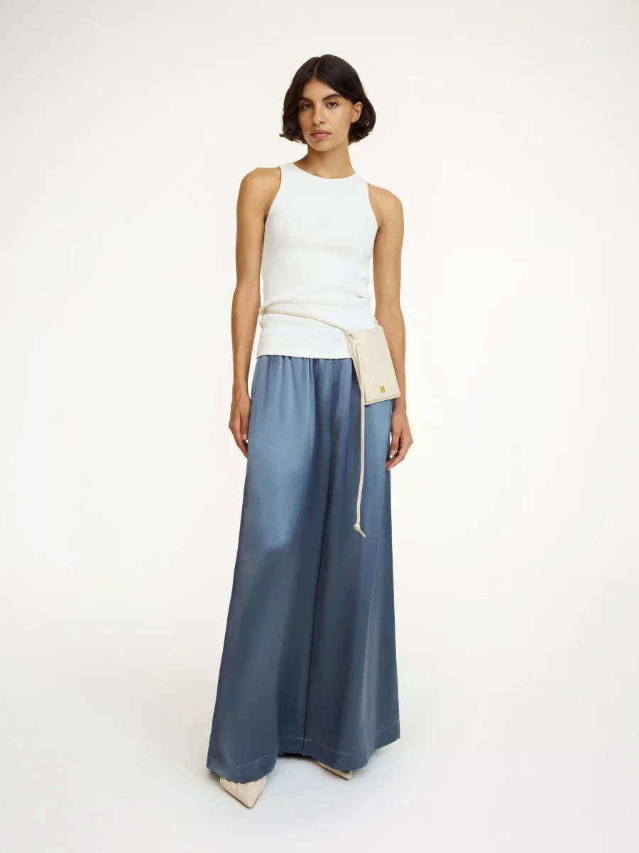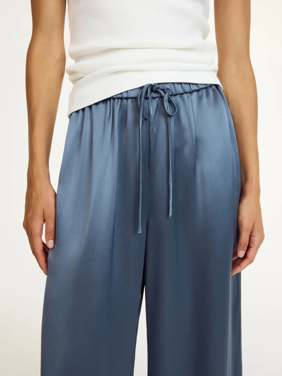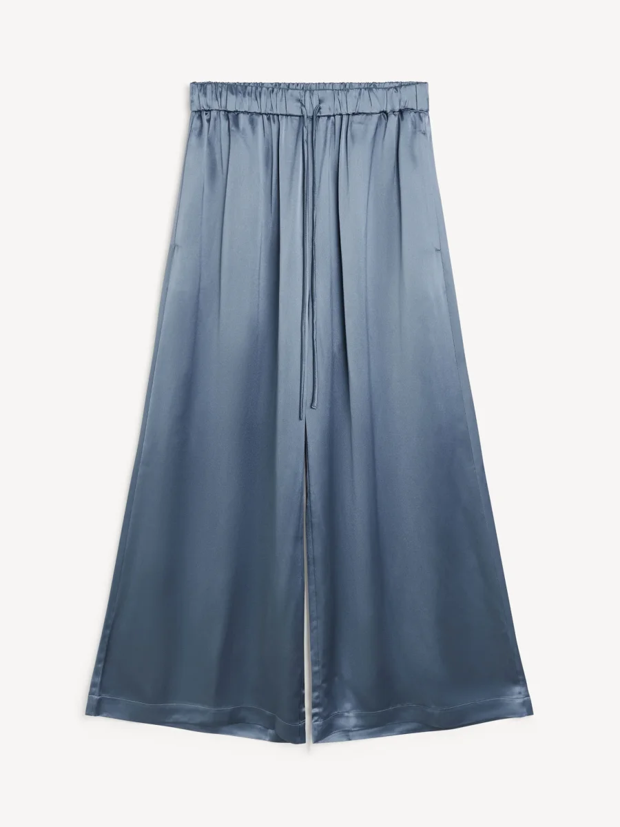 With its lustrous fabrication and care-free silhouette, the Clorella design works equally for day- and nighttime. Inspired by the classic pyjamas, the wide-leg trousers have an elastic waistband with adjustable ties, completed with side pockets.