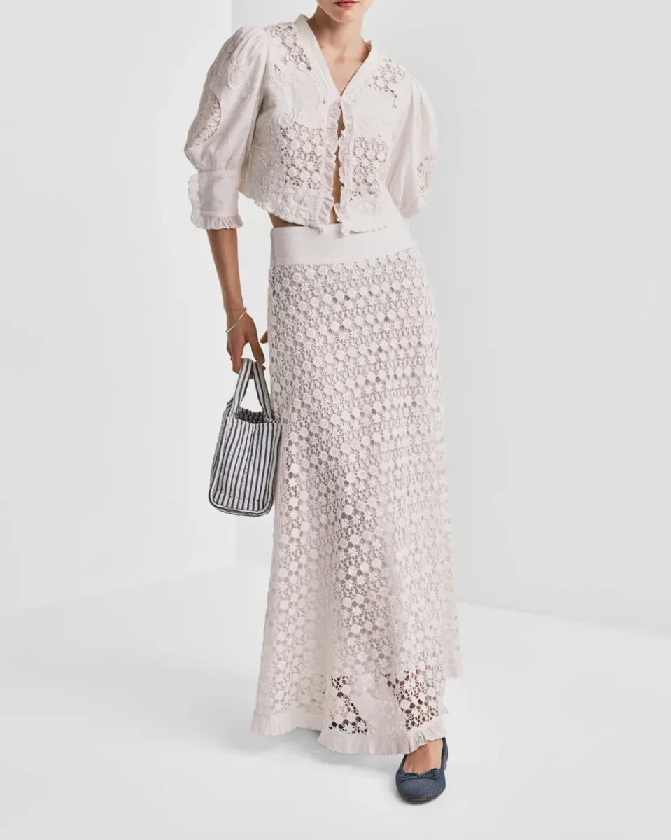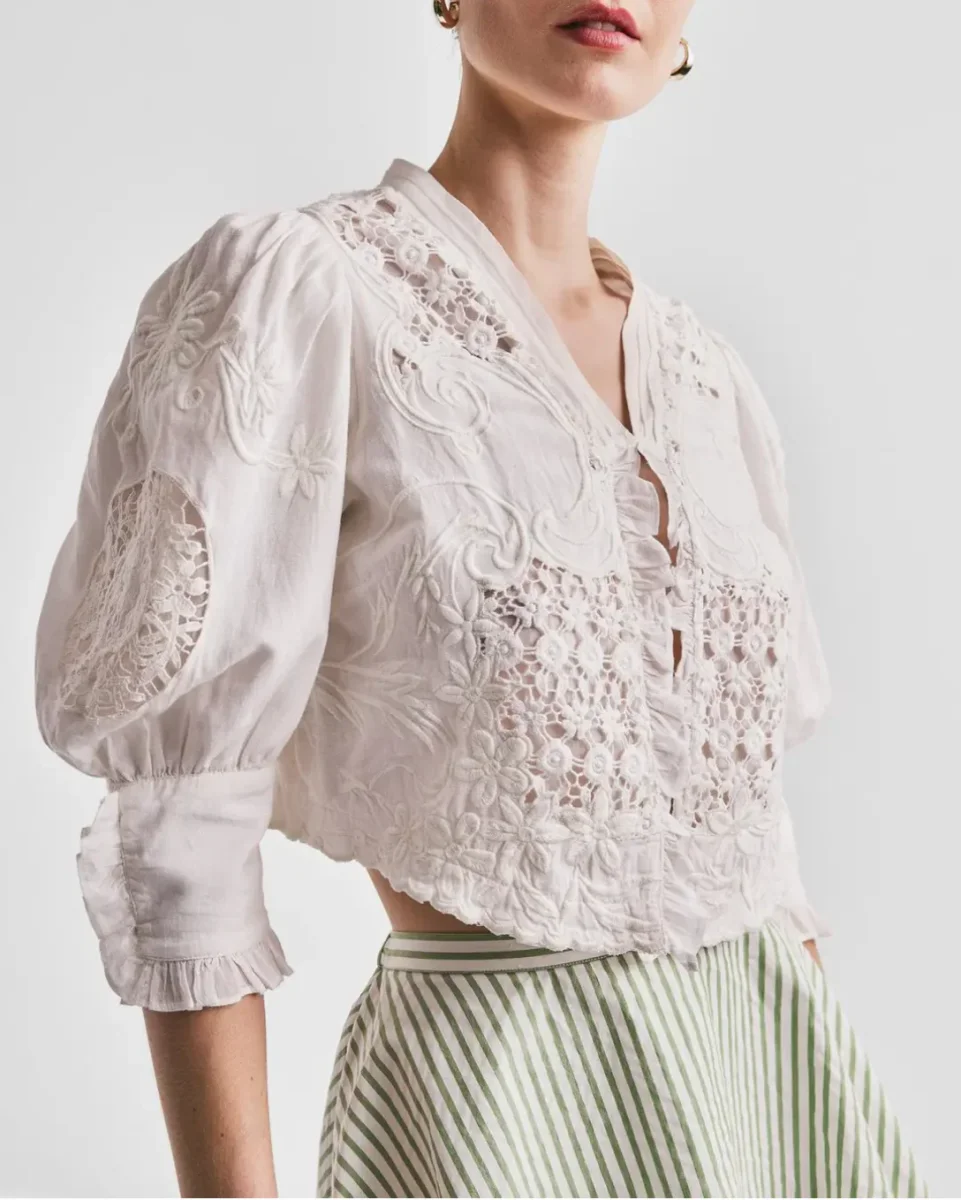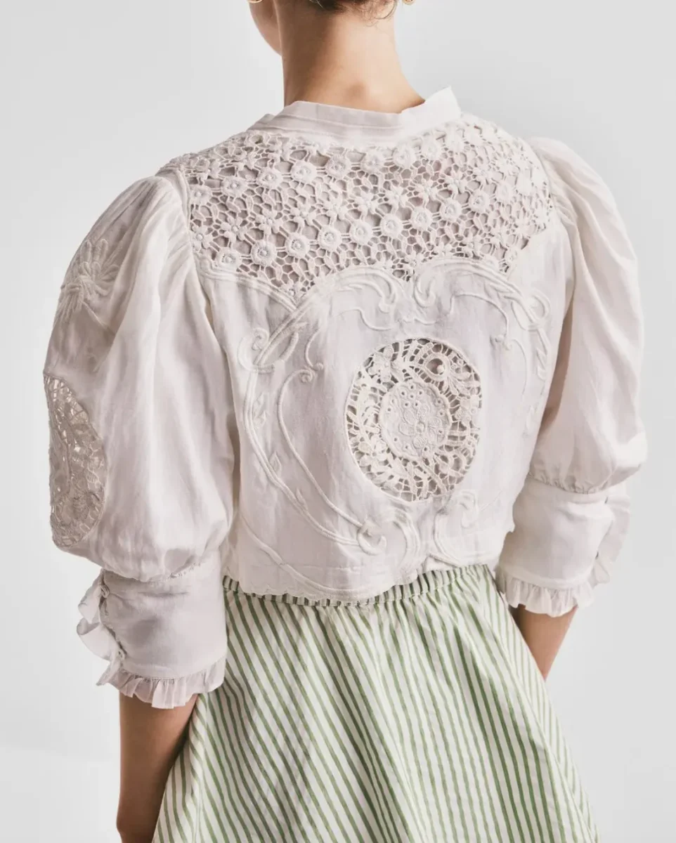 The Linen Jacket is cut in our elegant and fine quality of certified linen and viscose. The jacket has a cropped fit, relaxed silhouette, V-neck, and short, puffed sleeves. The tight cuffs are decorated with buttons and delicate ruffle details on the hemline. It is covered with delicate broderie and embroidery inserts. The jacket closes in the front with buttons. Made to be layered or combined with the Linen Skirt or one of our silky dresses or skirts for a beautiful texture contrast.