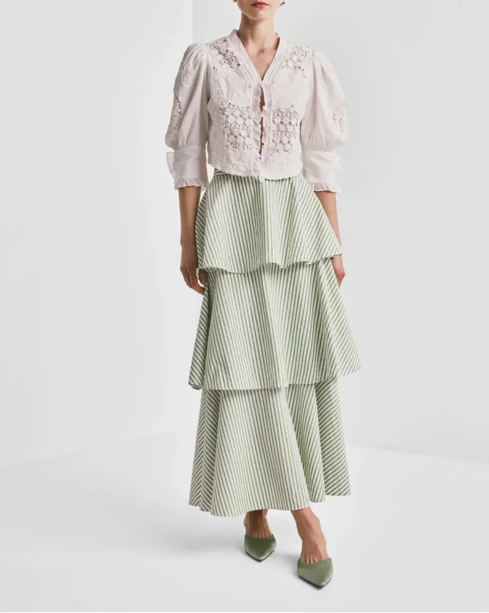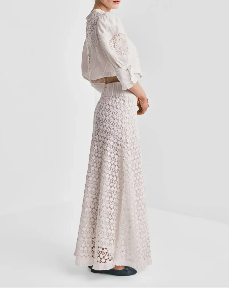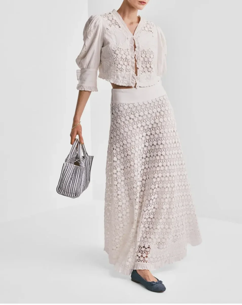 The Linen Jacket is cut in our elegant and fine quality of certified linen and viscose. The jacket has a cropped fit, relaxed silhouette, V-neck, and short, puffed sleeves. The tight cuffs are decorated with buttons and delicate ruffle details on the hemline. It is covered with delicate broderie and embroidery inserts. The jacket closes in the front with buttons. Made to be layered or combined with the Linen Skirt or one of our silky dresses or skirts for a beautiful texture contrast.