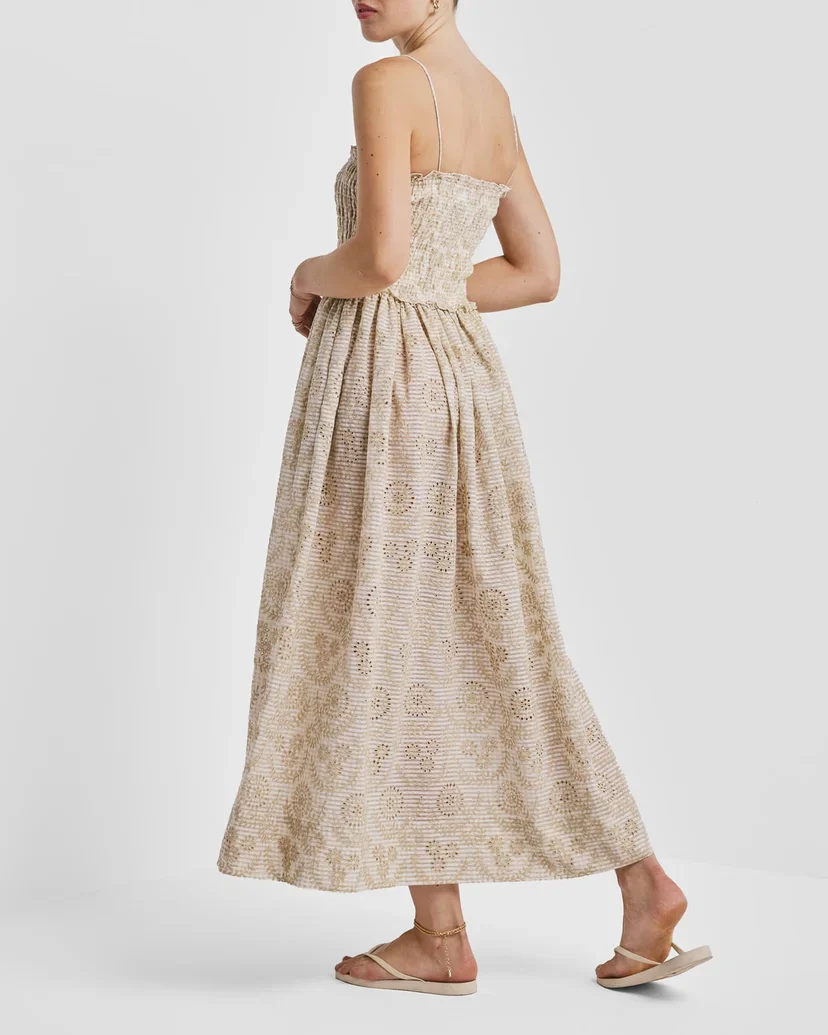 The Checks Bandeau Dress is crafted from our soft and lightweight GRS certified fabric, with embroidery detailing. The dress has a midi length, square neckline, thin shoulder straps and a fitted smocked top. The skirt features gatherings at the waist creating volume and movement.