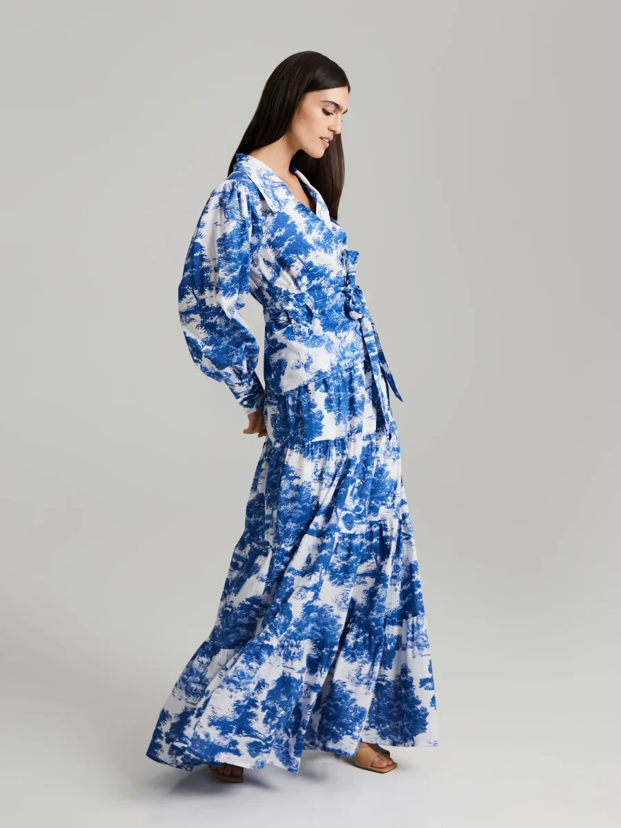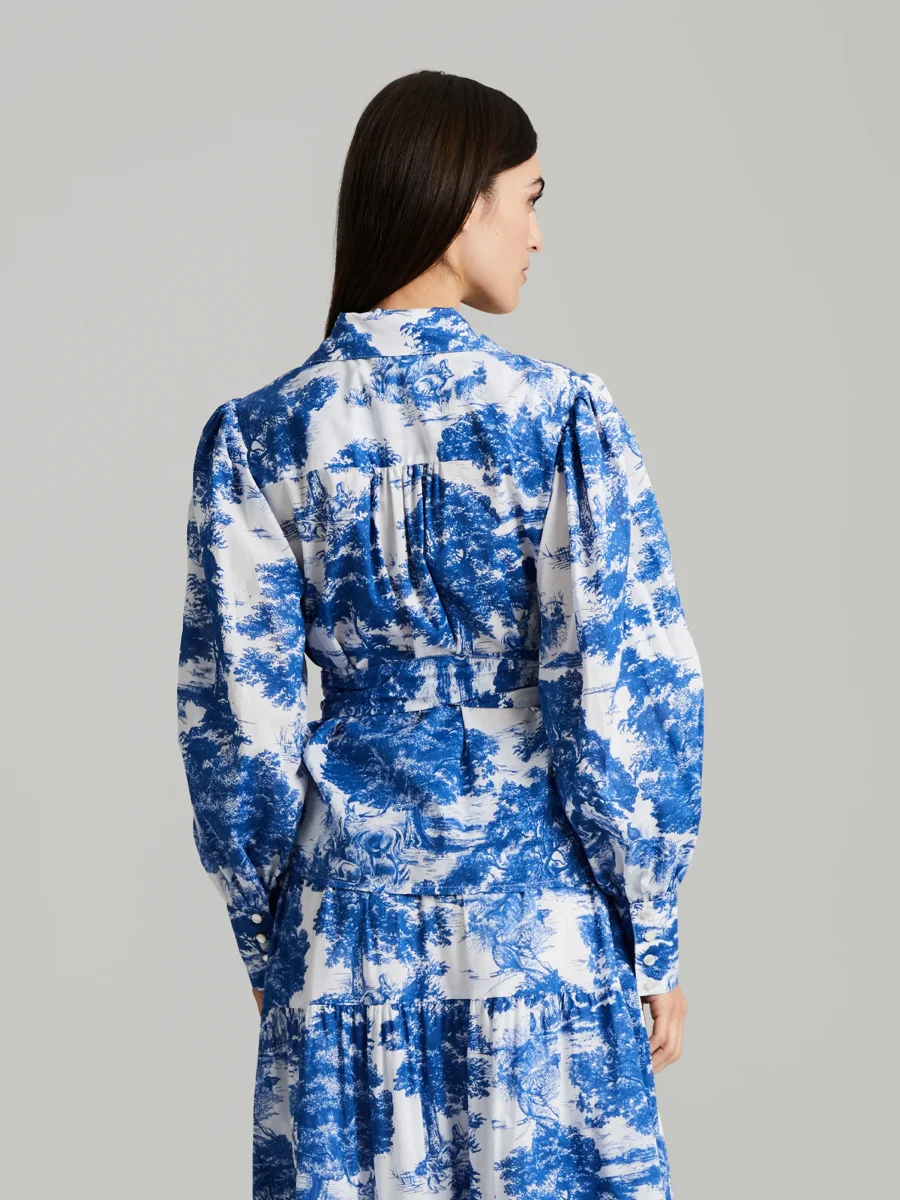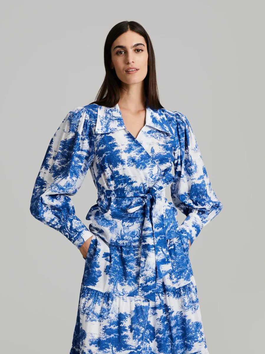 Omlottblus med band att knyta i midjan, kragar, vida muddar och pösiga ärmar med rynkning vid axlarna.