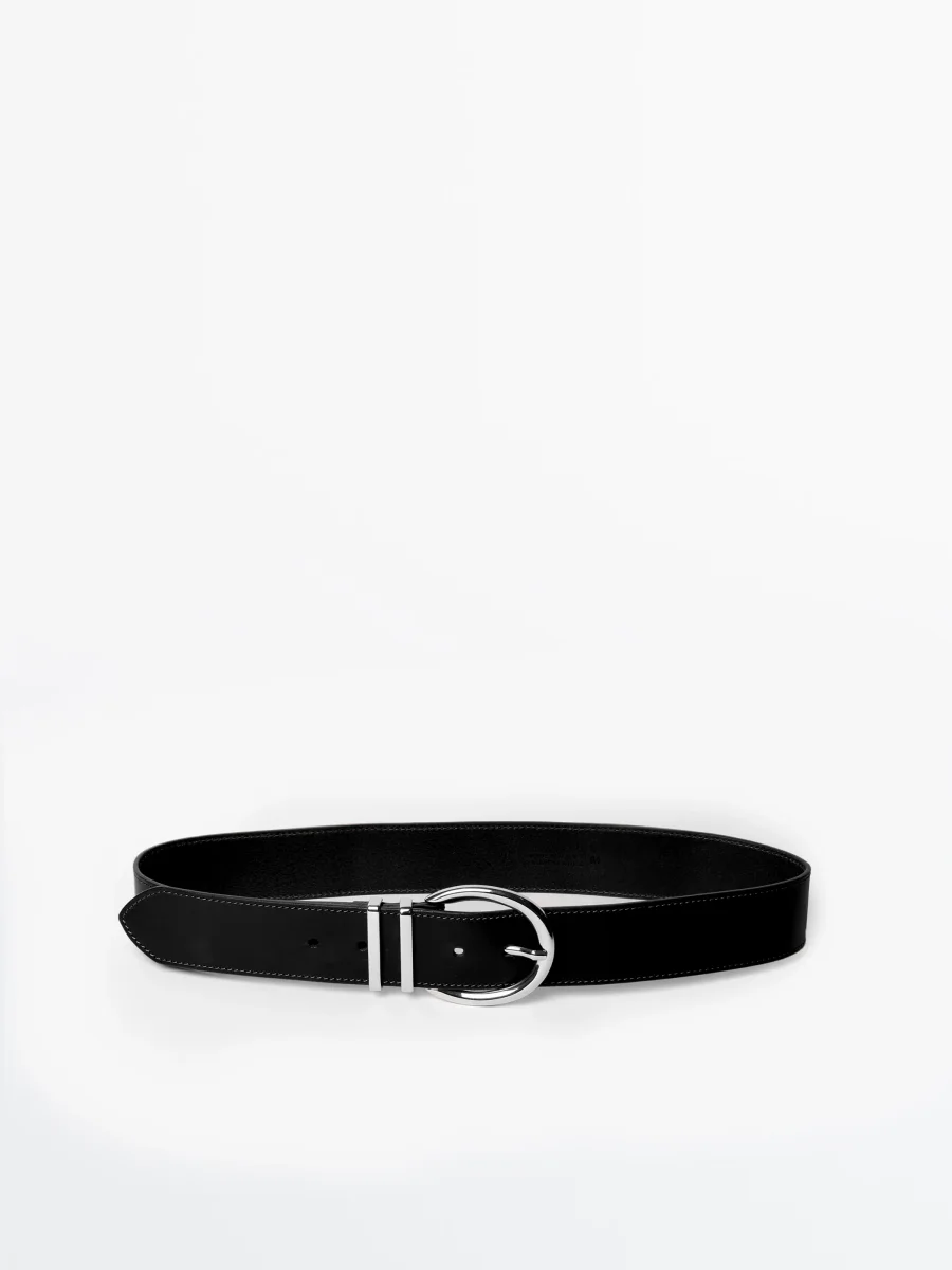 Läderbälte i svart med silvermetalldetaljer och spänne.