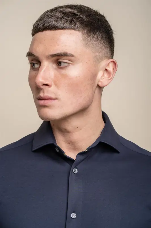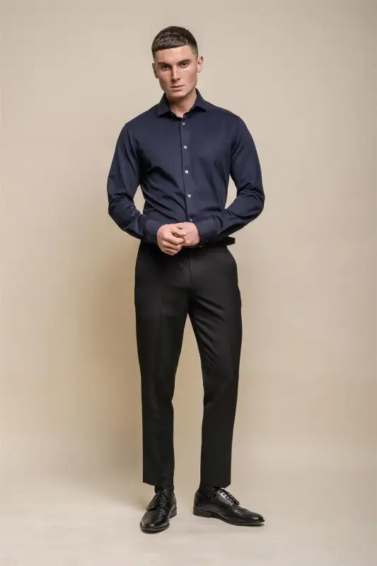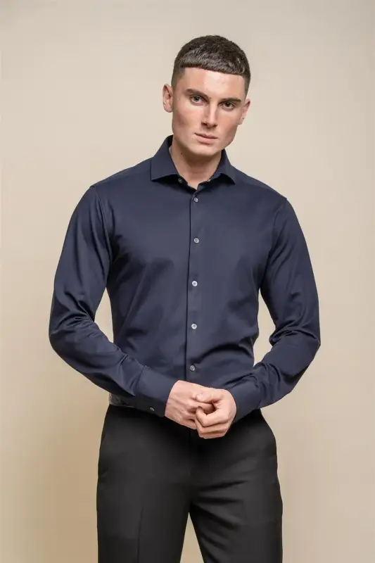 Cavani – Ashley Skjorta Marinblå Komplettera din outfit med denna eleganta skjorta från Cavani. Skarp och stilren. Perfekt att kombinera med våra herrkostymer och accessoarer! Specifikationer Märke: Cavani Material: 65% bomull, 35% polyester Färg: Marinblå Slimfit Storlekar: S, M, L, XL, XXL