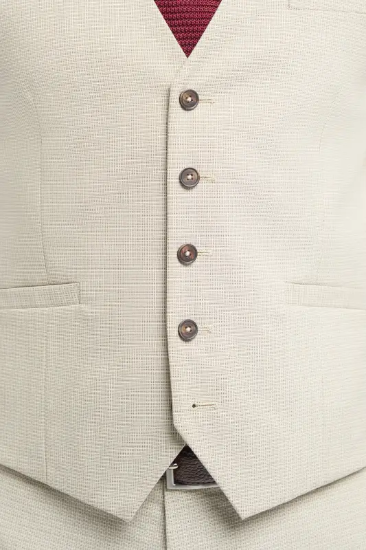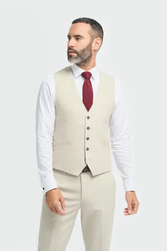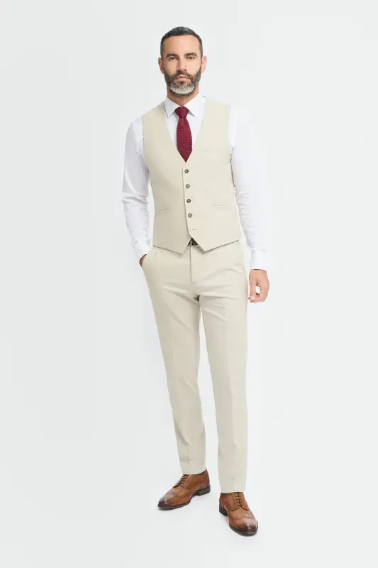 Beige är sommarens färg! Därför är denna väst det perfekta tillskottet till varje somrig outfit. Ska du på bröllop, en annan speciell tillställning eller vill du helt enkelt se ut som en äkta gentleman? Då är det här västen du behöver. Bär den till vardags för att ge din look en elegant touch. Vill du ta det ett steg längre? Matcha då västen med den beiga Cavani Hampton-kavajen och de beiga Hampton-byxorna. Resultatet? En stilren tredelad kostym där alla delar harmoniserar perfekt med varandra.