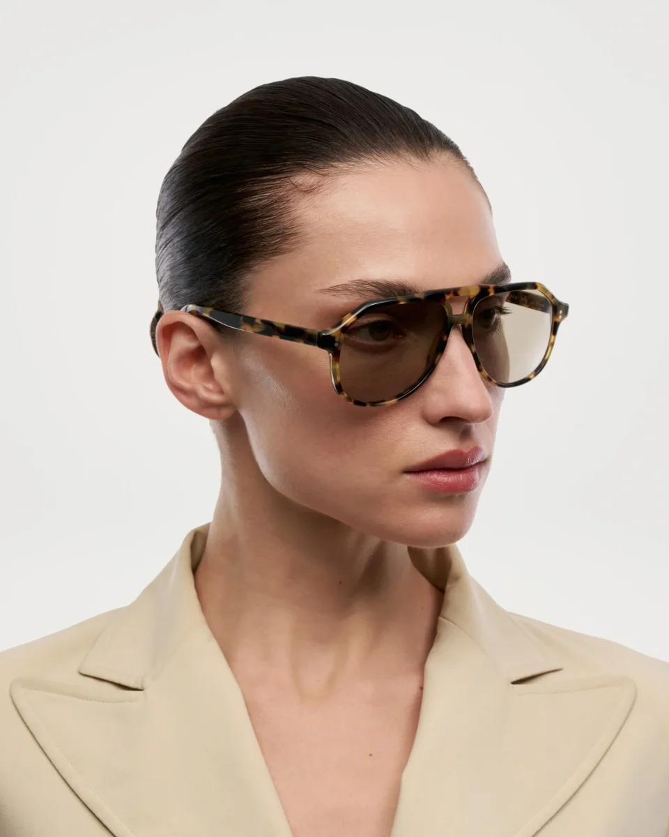 An aviator silhouette with structured contours and arched double bridge. Finished with custom made metal detailing characterized by our signature metal trim.