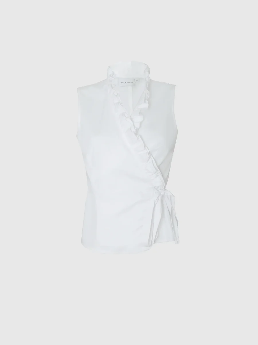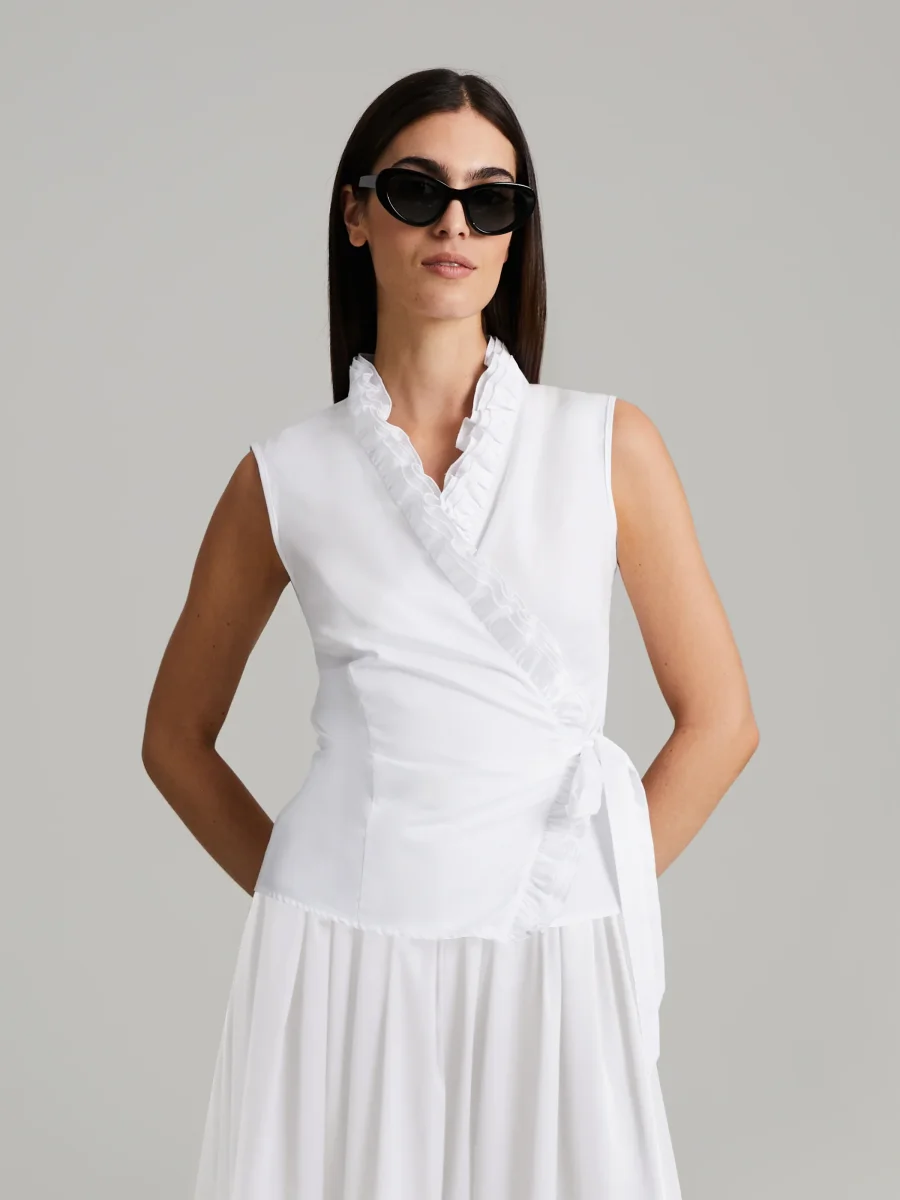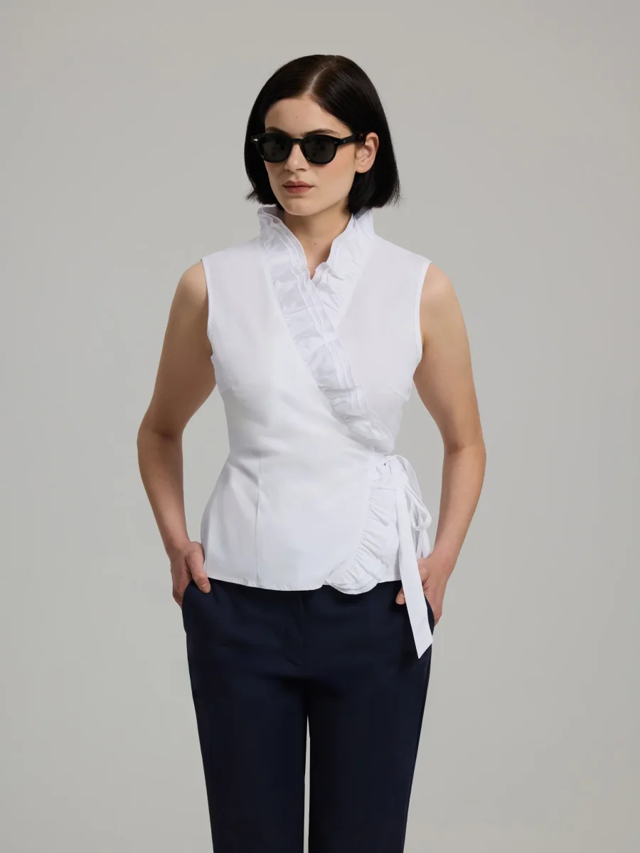 Topp med omlott och volanger vid halsringningen. Ärmlös, band att knyta vid midjan och en formsydd siluett.