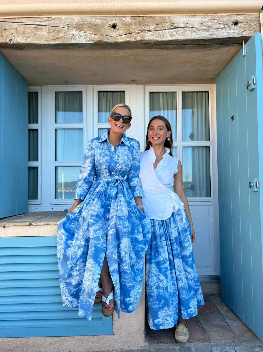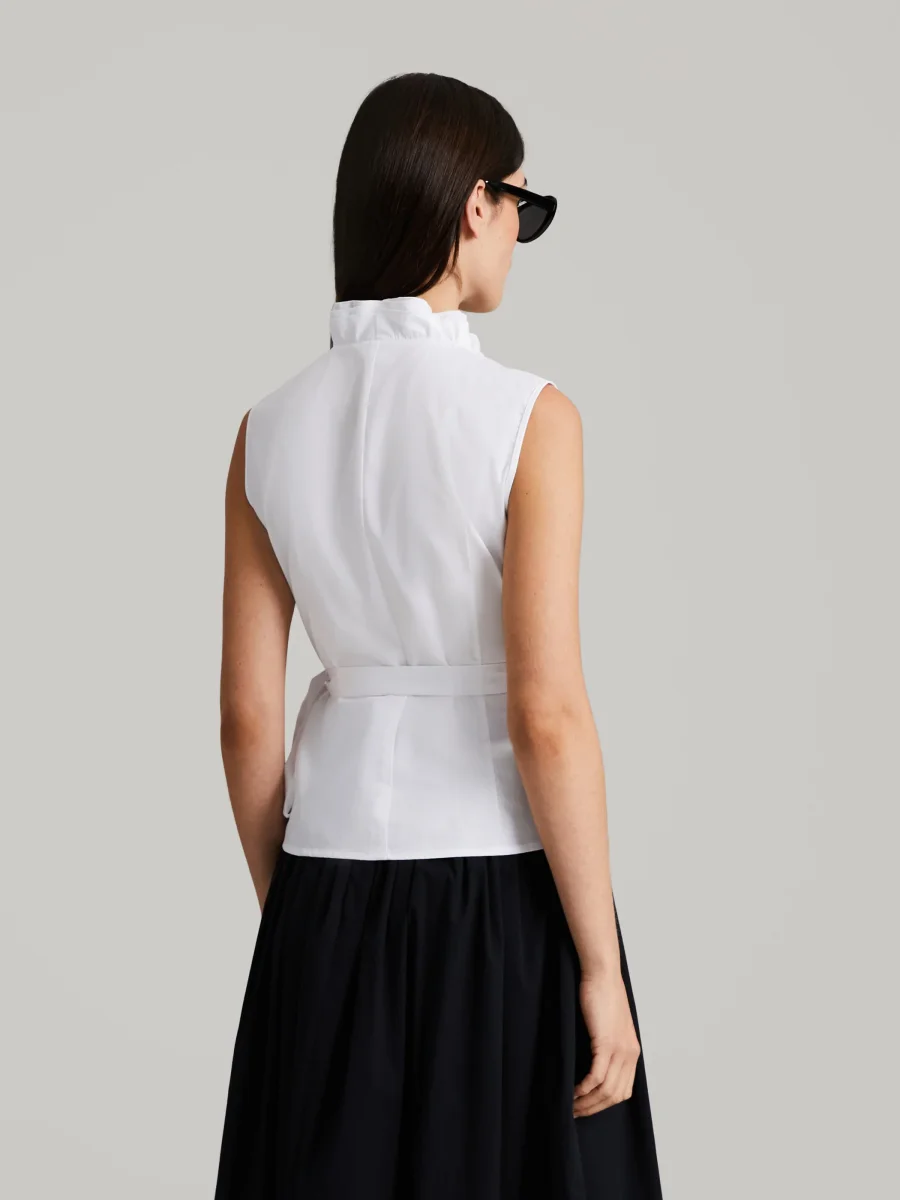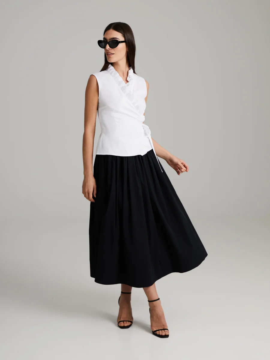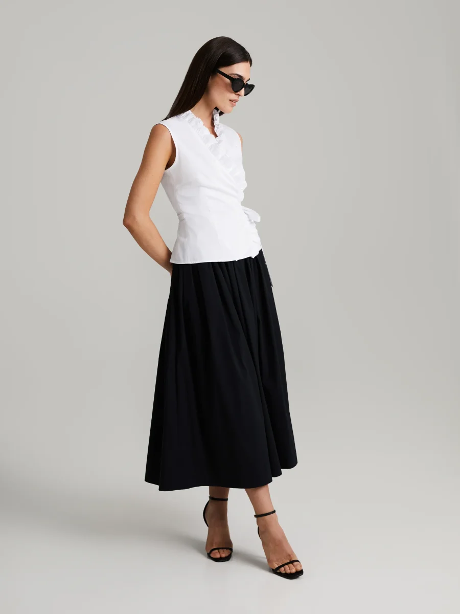 Topp med omlott och volanger vid halsringningen. Ärmlös, band att knyta vid midjan och en formsydd siluett.