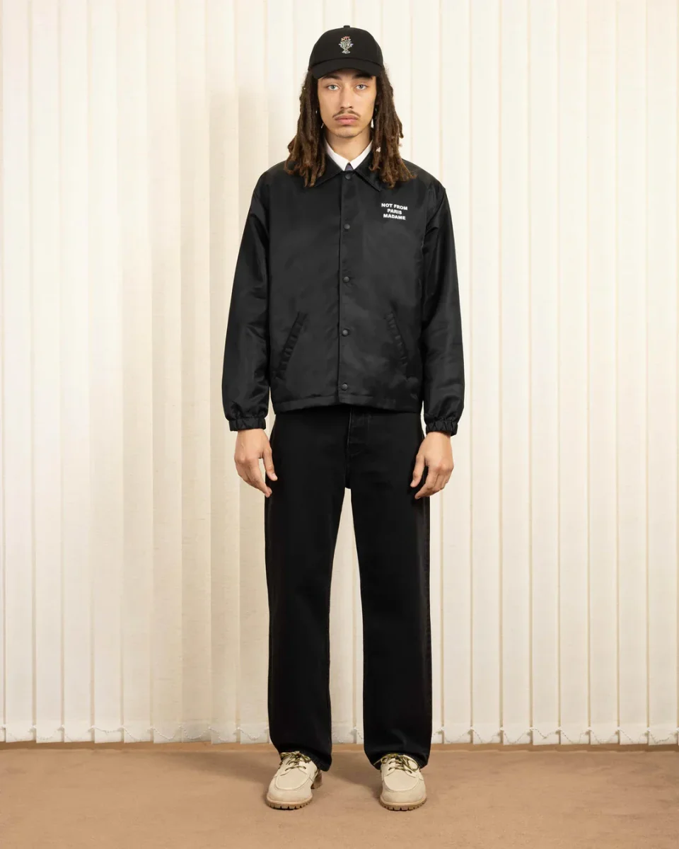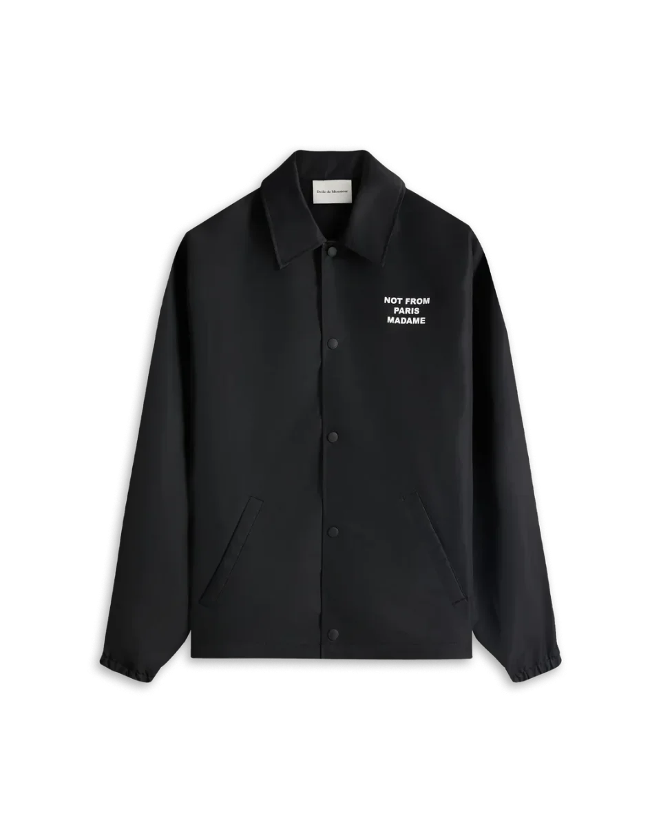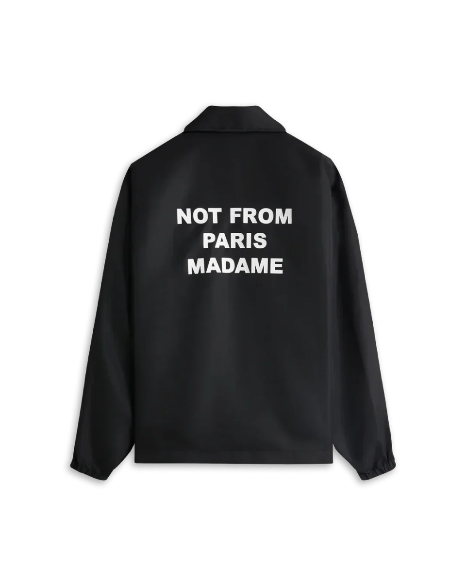 A timeless piece. This black water-repellent jacket with elasticated wrists and engraved snap buttons is printed with the ’Not From Paris Madame’ slogan front and back.