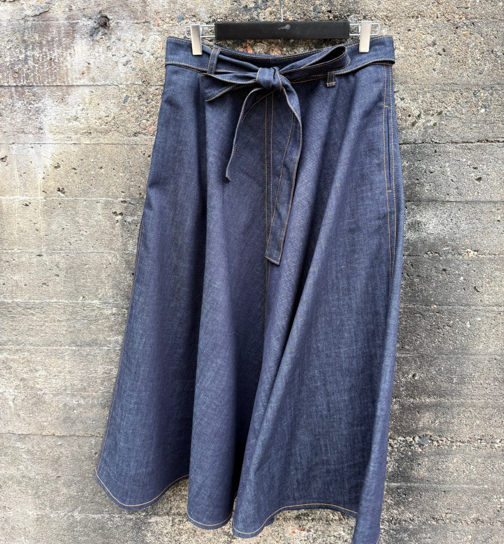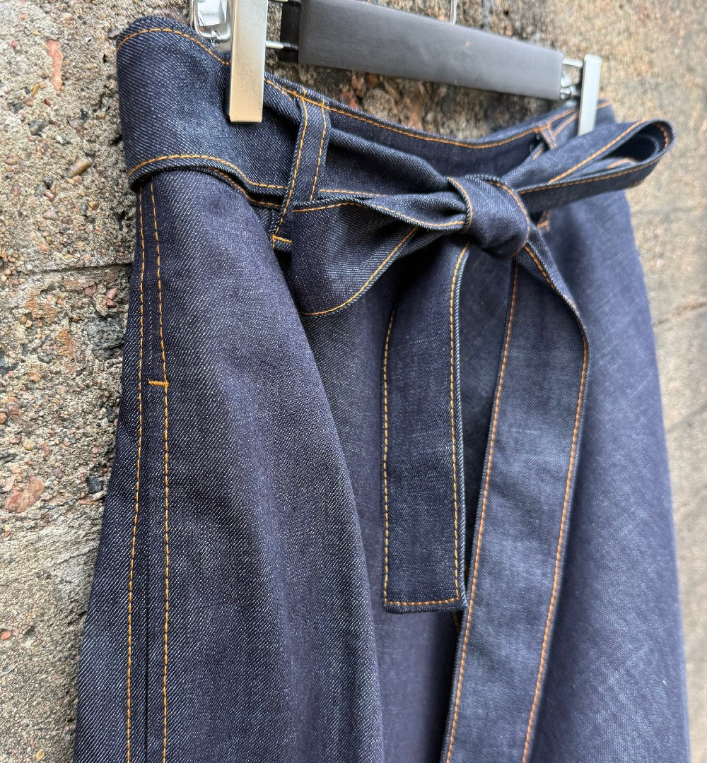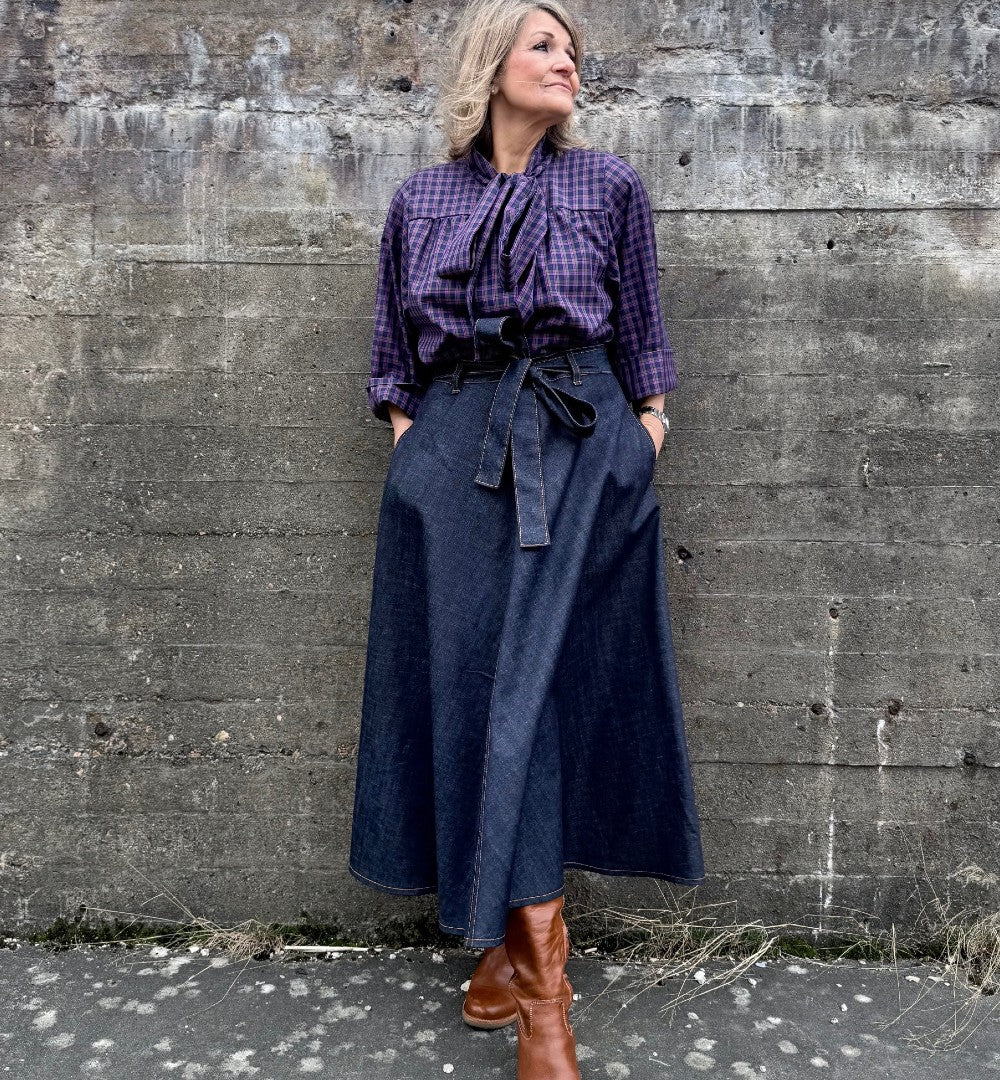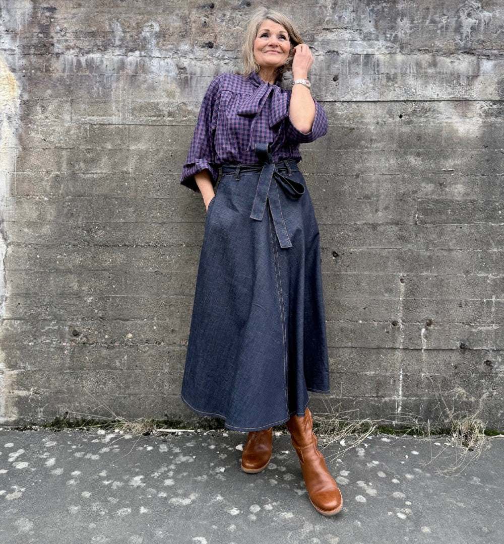 Modellen Emilia har tidigare älskats som en härlig modell med mycket vidd. Nu har den kommit en riktigt snygg mörkt blå denim med dekorativa tobacco-sömmar Den har en del tyngd men faller så fint över stuss och midja. Dragkedja bak och ett bälte att knyta med som förstås är avtagbart.