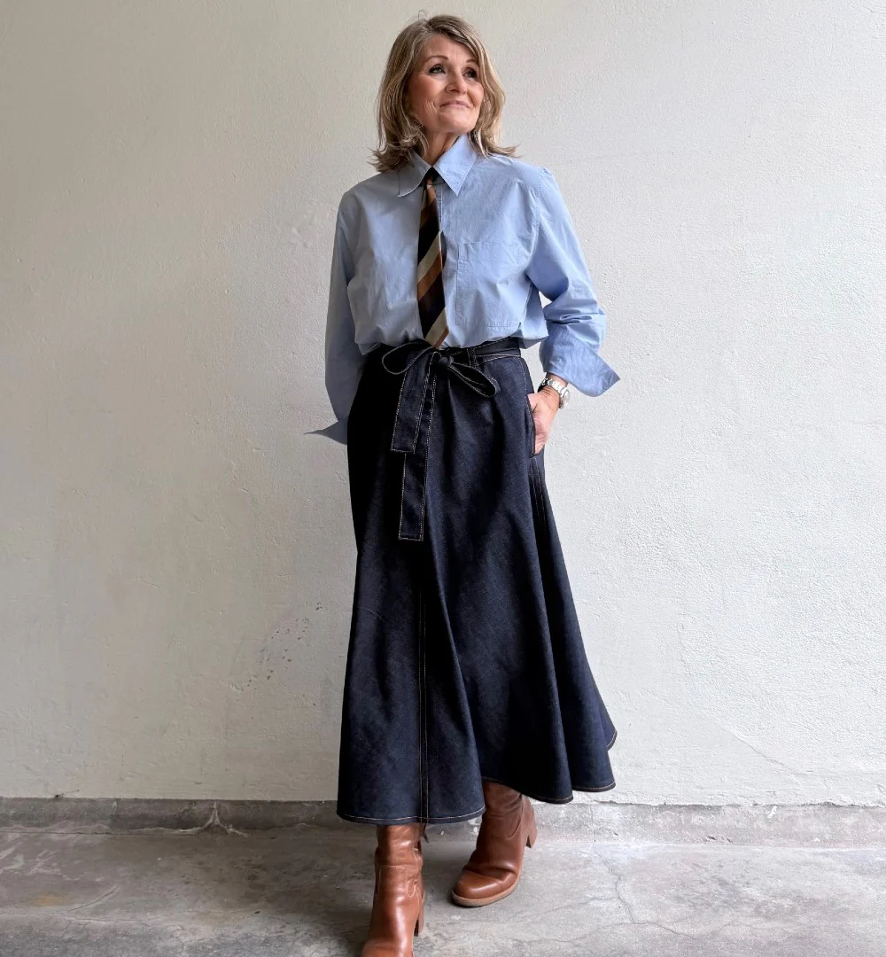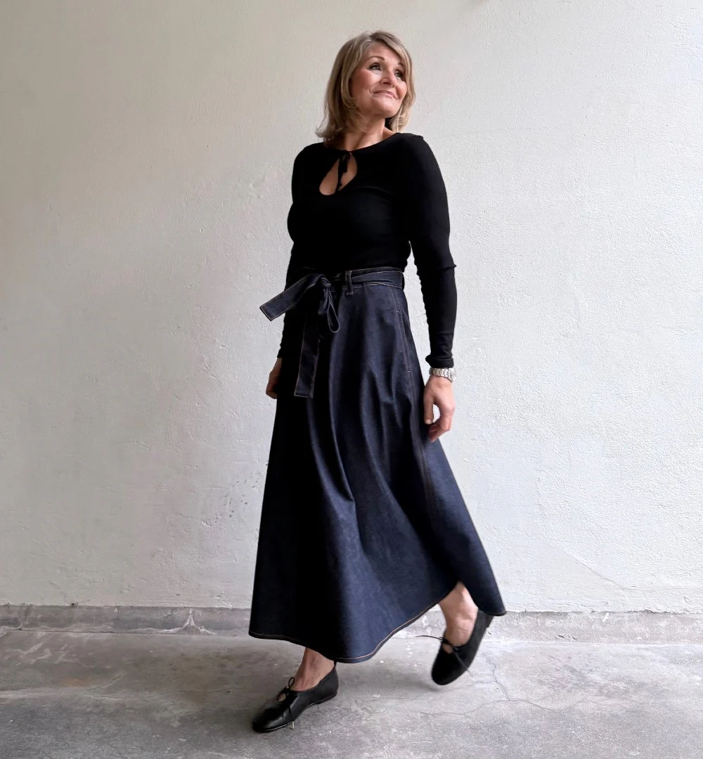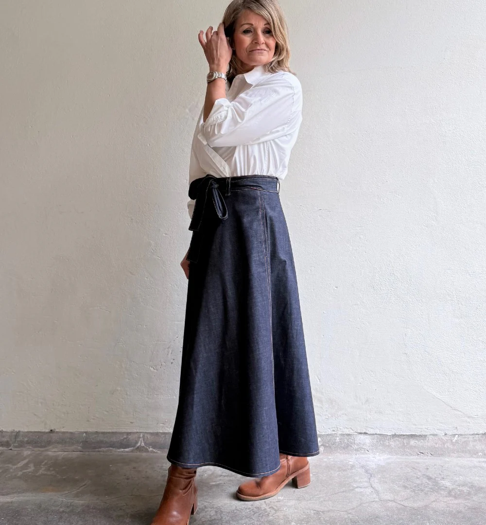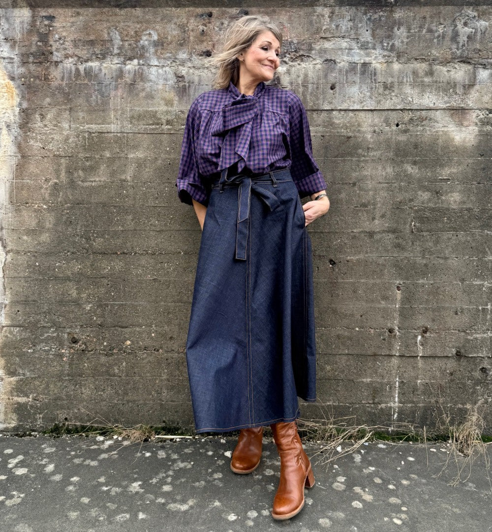 Modellen Emilia har tidigare älskats som en härlig modell med mycket vidd. Nu har den kommit en riktigt snygg mörkt blå denim med dekorativa tobacco-sömmar Den har en del tyngd men faller så fint över stuss och midja. Dragkedja bak och ett bälte att knyta med som förstås är avtagbart.