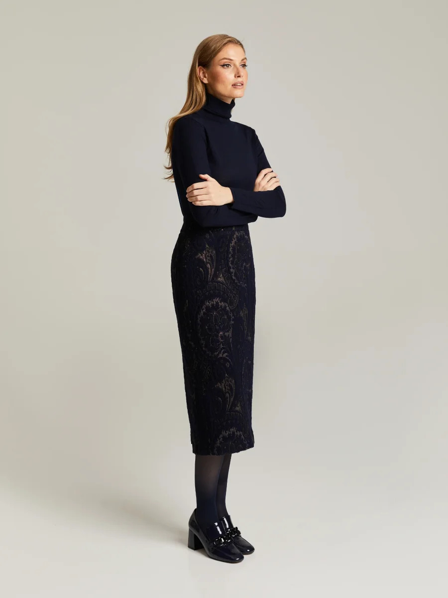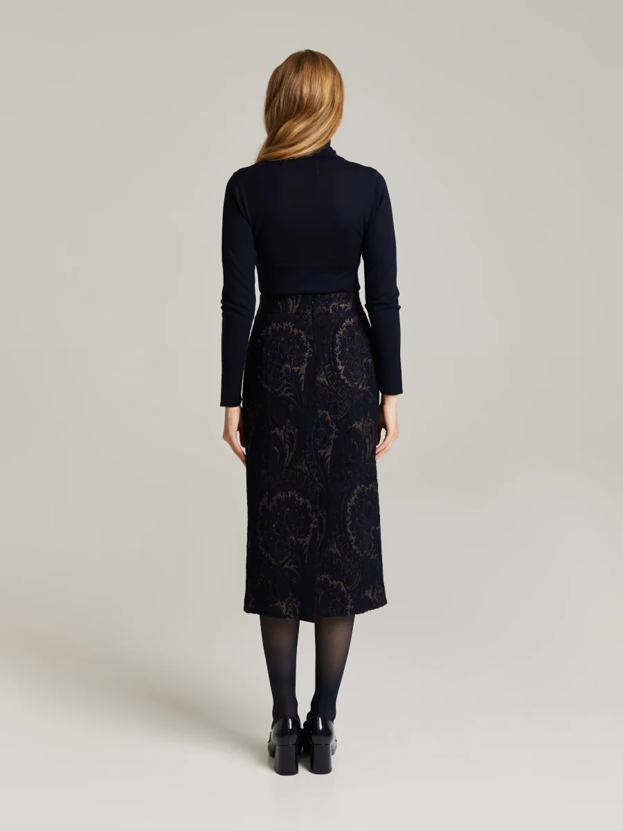 Klassisk, skräddarsydd pennkjol. Strax under knälång fåll, och dold dragkedja och slits baktill. Kjolen är fodrad.