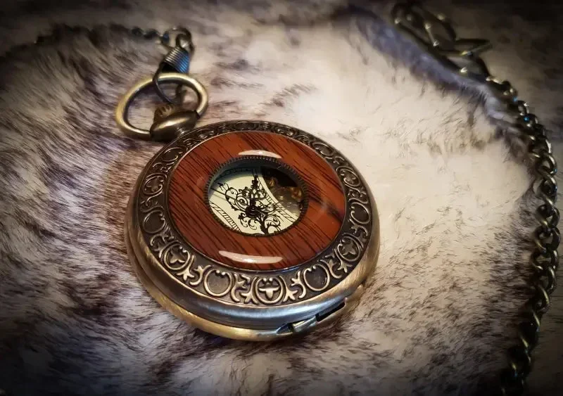 Det här vackra fickuret passar perfekt in i din klocksamling. Fickuret är i brons med trä på framsidan. Den romerska urtavlan ger klockan en unik retrolook!