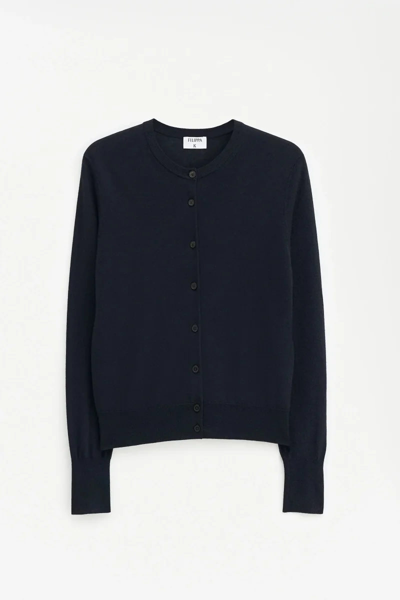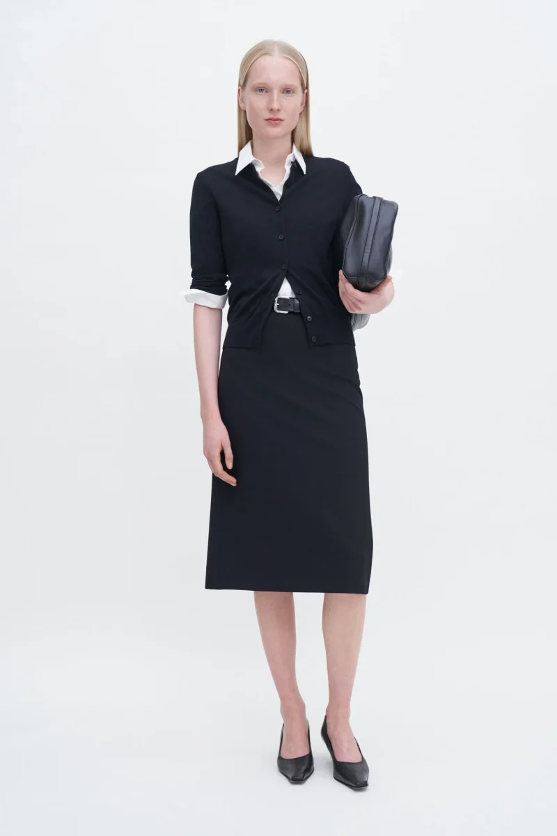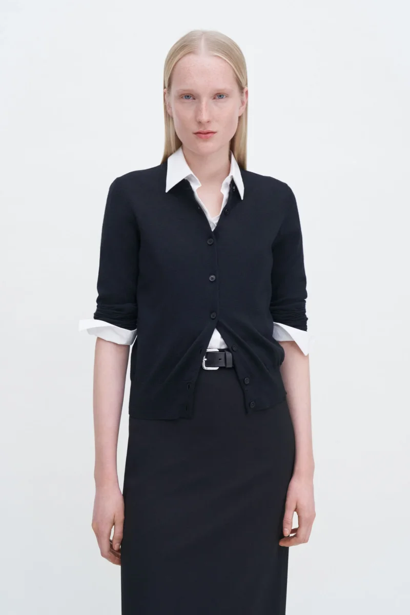 Merino Short Cardigan har en smal passform och är stickad i lätt, svart merinoull. Designad med knäppning framtill och höftlängd. Bär den över t-shirts och linnen eller under en jacka. Det här plagget är en del av vår Core Collection: permanenta stilar designade med de väsentliga delarna av en basgarderob i åtanke.