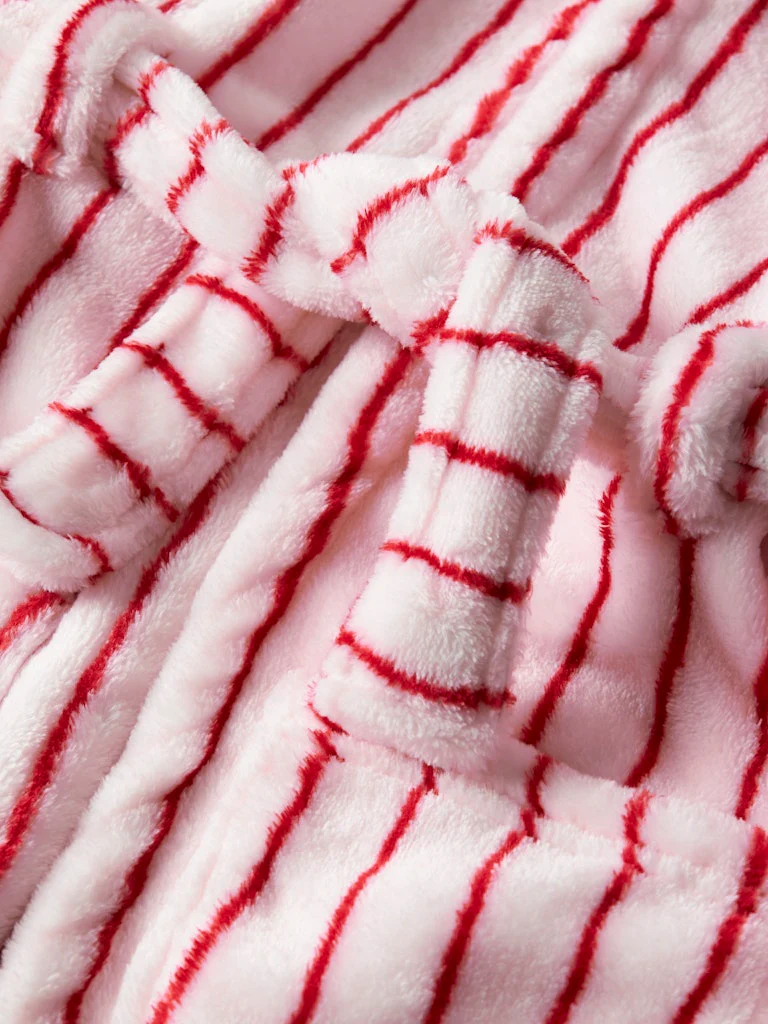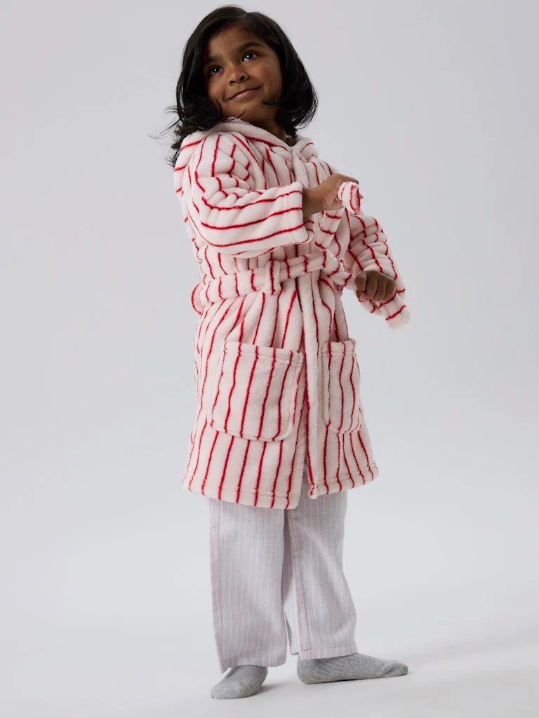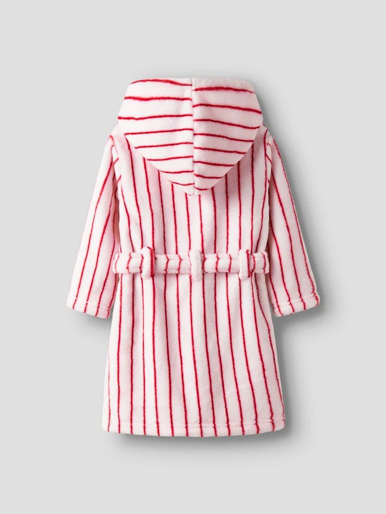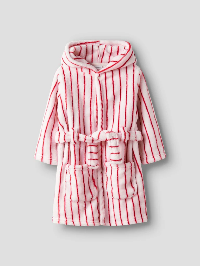 Härlig morgonrock i mjukaste lurviga fleece velour av återvunnen polyester. Knapp i halsen så den går att knäppa och sedan knyte i midjan att stänga med . Velour är ett mjukt och glänsande tyg med fibrer som följer handens drag för en fin effekt.