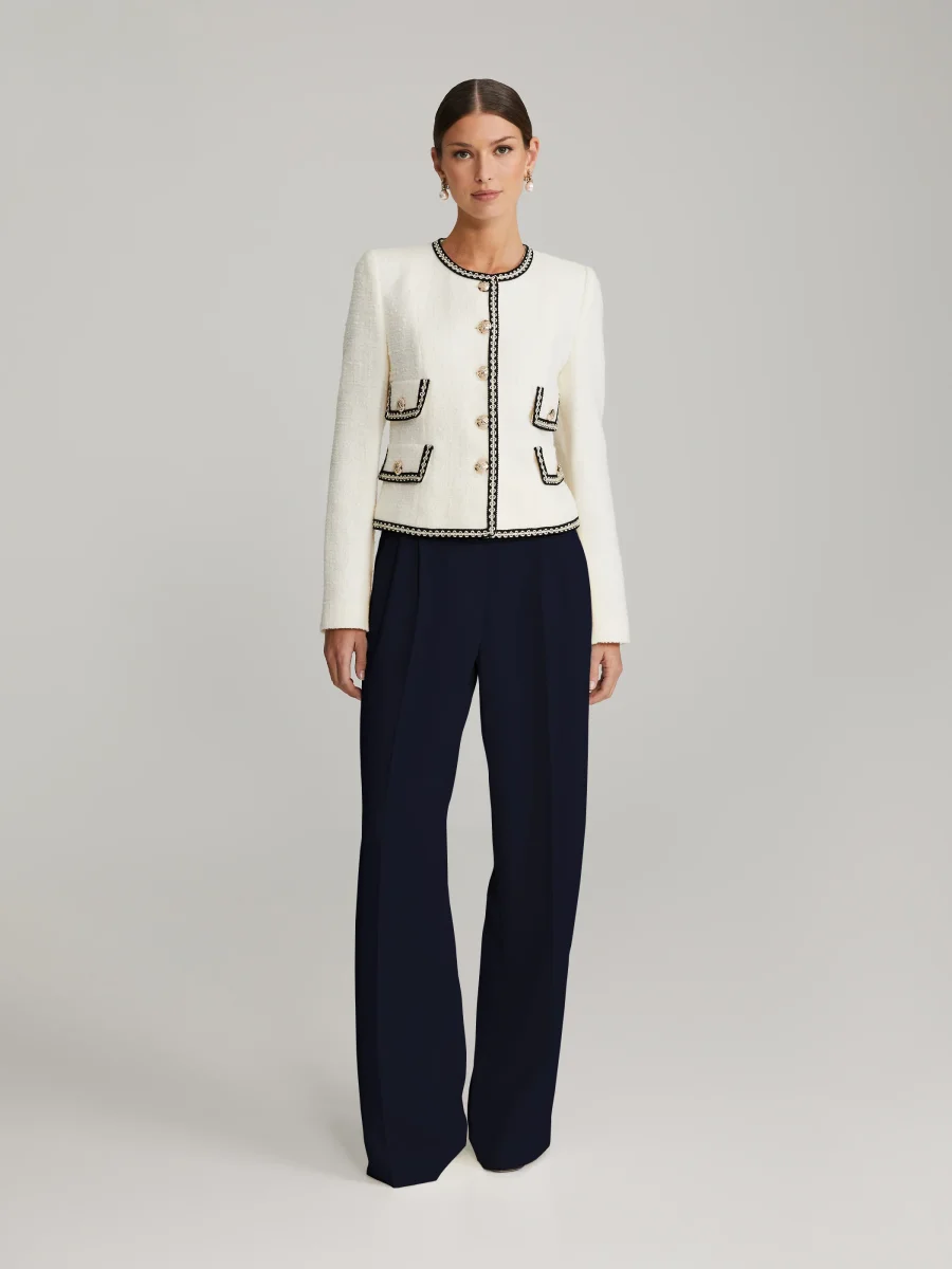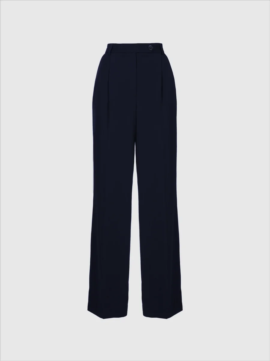 Hellånga byxor med vida ben. Pressade veck fram och bak, fickor på sidorna, bälteshällor samt dragkedja och knappstängning.