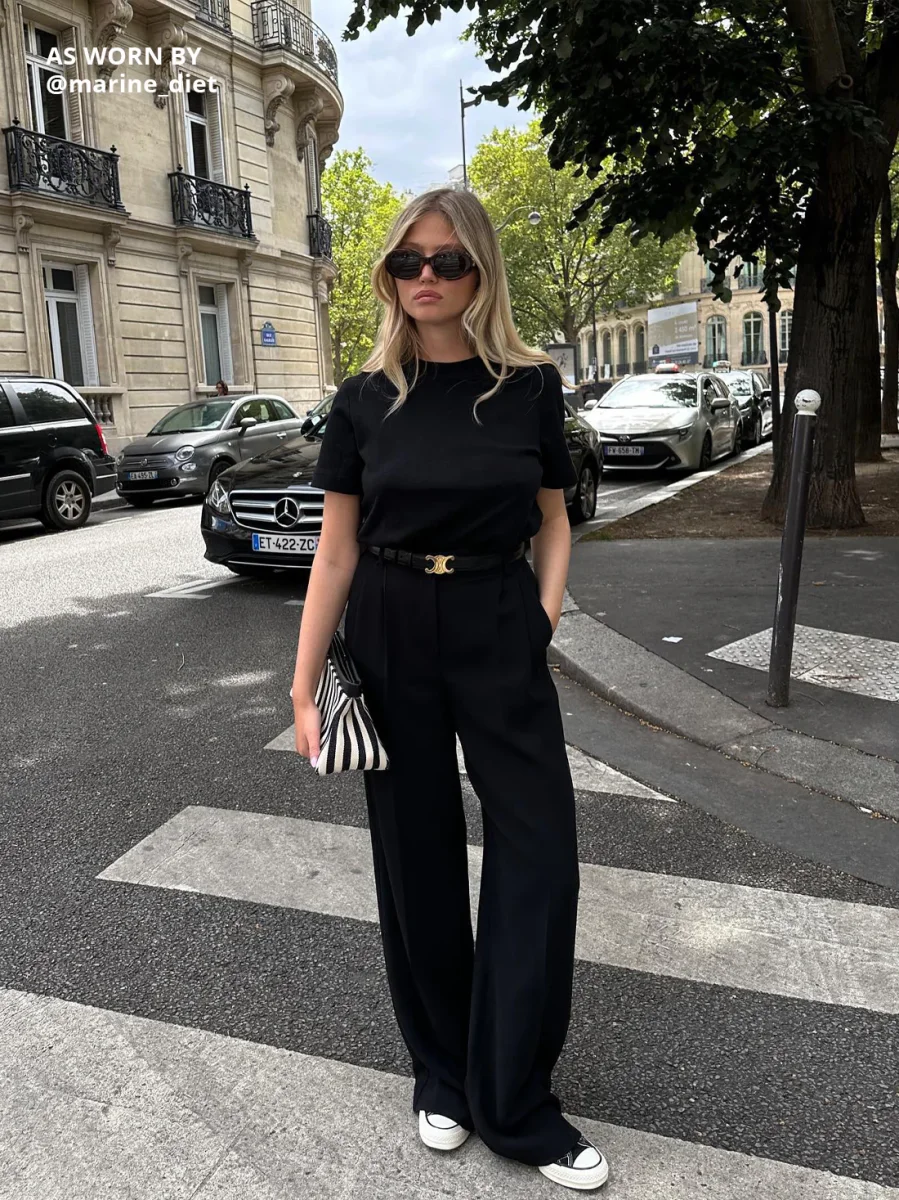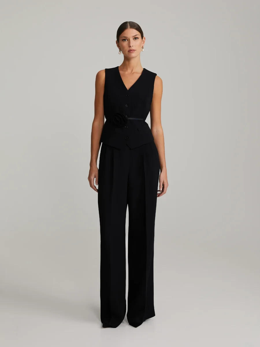 Hellånga byxor med vida ben. Pressade veck fram och bak, fickor på sidorna, bälteshällor samt dragkedja och knappstängning.
