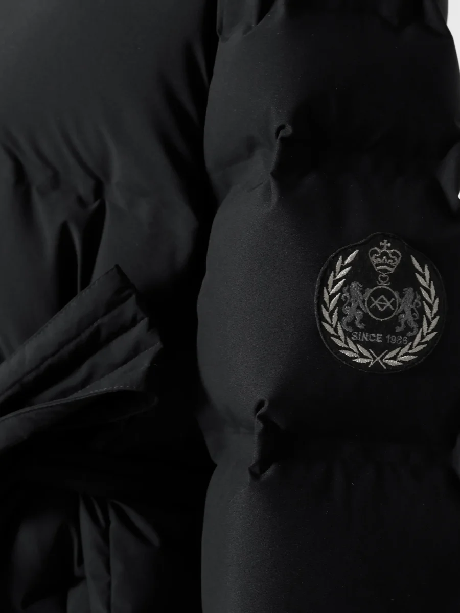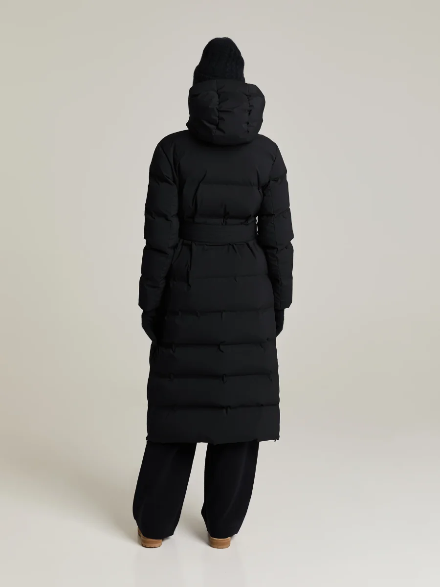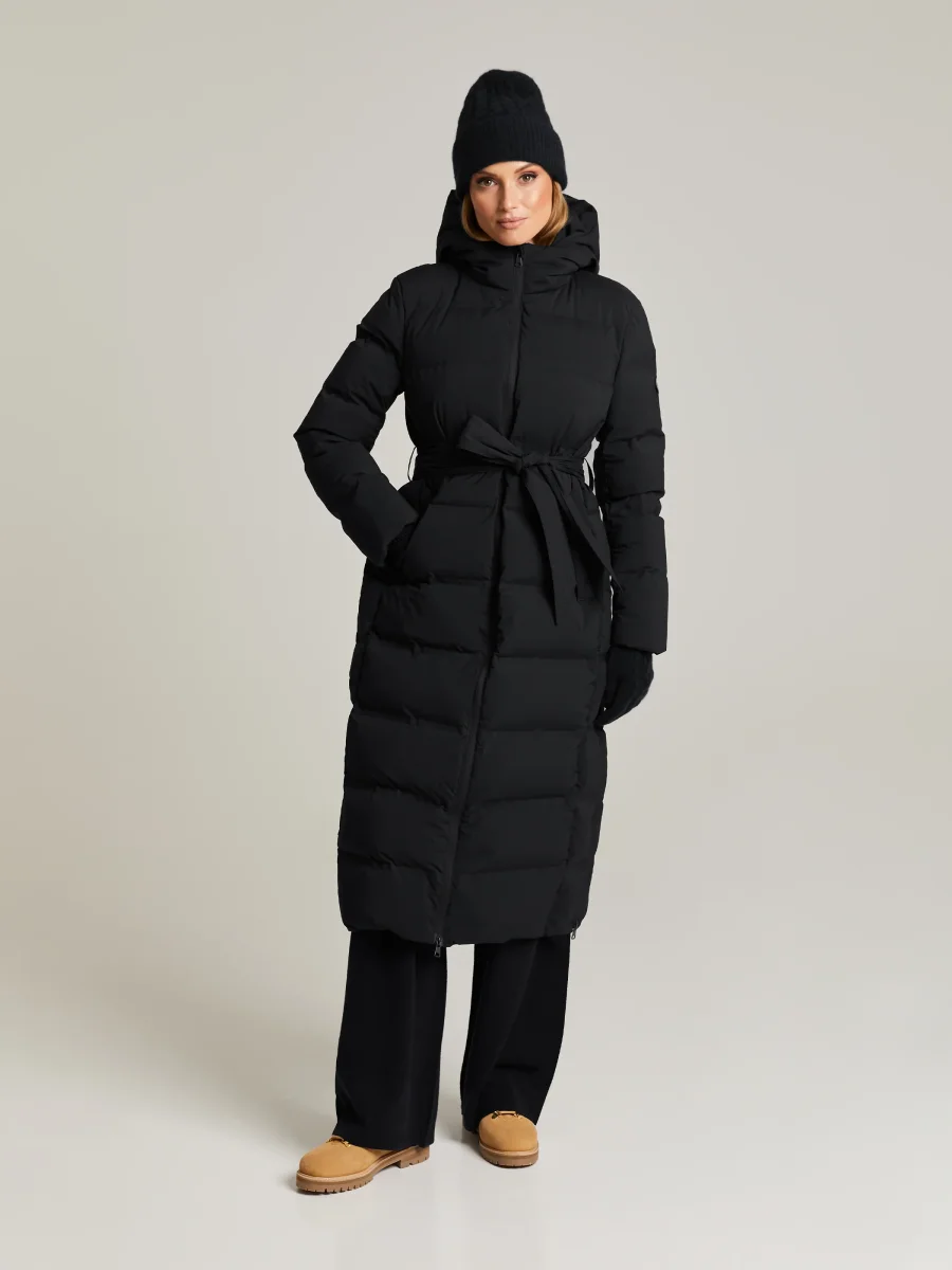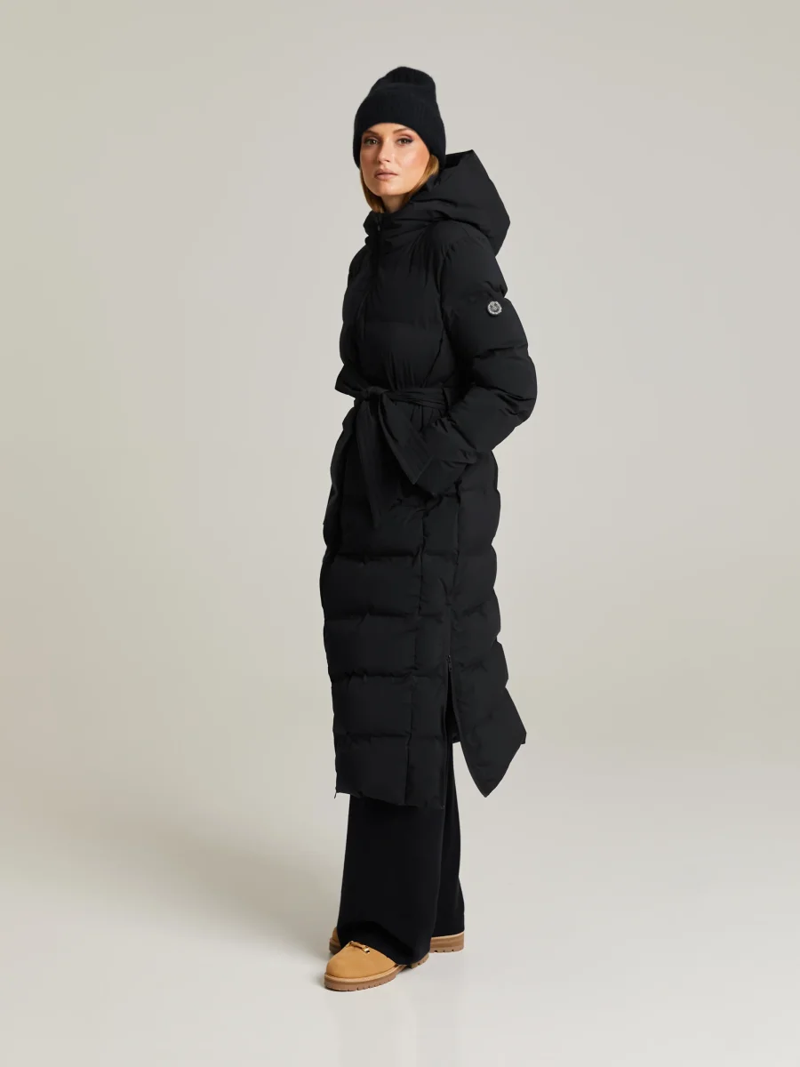 Lång dunjacka med tvåvägsdragkedja. Två sidofickor med knapp, avtagbart knytbälte och dragkedjor i sidorna för extra rörelsefrihet.