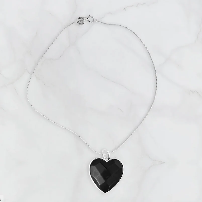 Halsband Big Heart i silverpläterad mässing med ett svart hjärta med en onyx som mäter mäter 40 mm i diameter. Halsbandet är 45 cm långt.