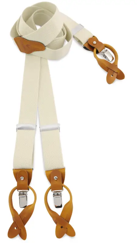 Den mjuka elfenbensvita färgen gör dessa hängslen lätta att matcha med många olika outfits. Kombinera dem med en mörk kostym för en stilfull, affärsmässig look eller bär dem med ljusare byxor och skjorta för en mer avslappnad känsla. Dessa hängslen är ett diskret men oumbärligt tillskott till din garderob.