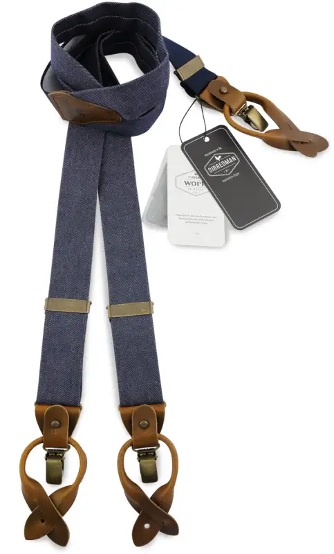 Gentleman’s hängslen i blå denim levereras med exklusiva läderöglor och robusta clips. För en klassisk och autentisk stil kan du använda det medföljande paketet med sex knappar, nål och tråd för att fästa öglorna på insidan av byxorna. Vill du ha en snabb och smidig lösning? Använd clipsen för att fästa hängslena direkt i byxkanten. Clips och öglor är avtagbara, så du kan enkelt anpassa stilen efter tillfälle och smak.