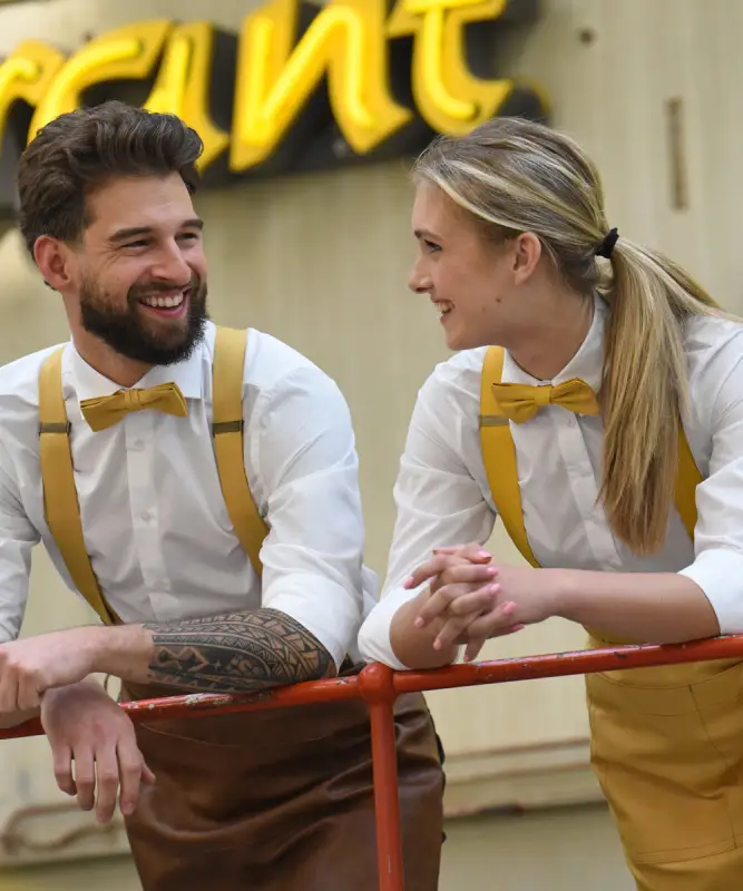 Gentleman’s hängslen i ockragul denim levereras med eleganta läderöglor och starka clips av hög kvalitet. För en traditionell look kan du sy fast knappar med hjälp av det medföljande paketet med knappar, nål och tråd. Föredrar du smidighet? Använd clipsen för att enkelt fästa hängslena i byxkanten. Både öglor och clips är avtagbara, vilket ger dig full kontroll över hur du vill bära dem.